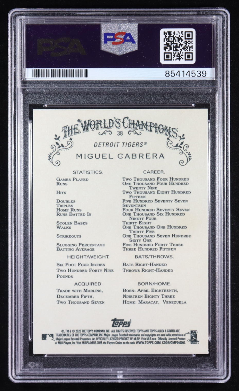 Miguel Cabrera Signed 2020 Topps Allen and Ginter #38 (PSA)