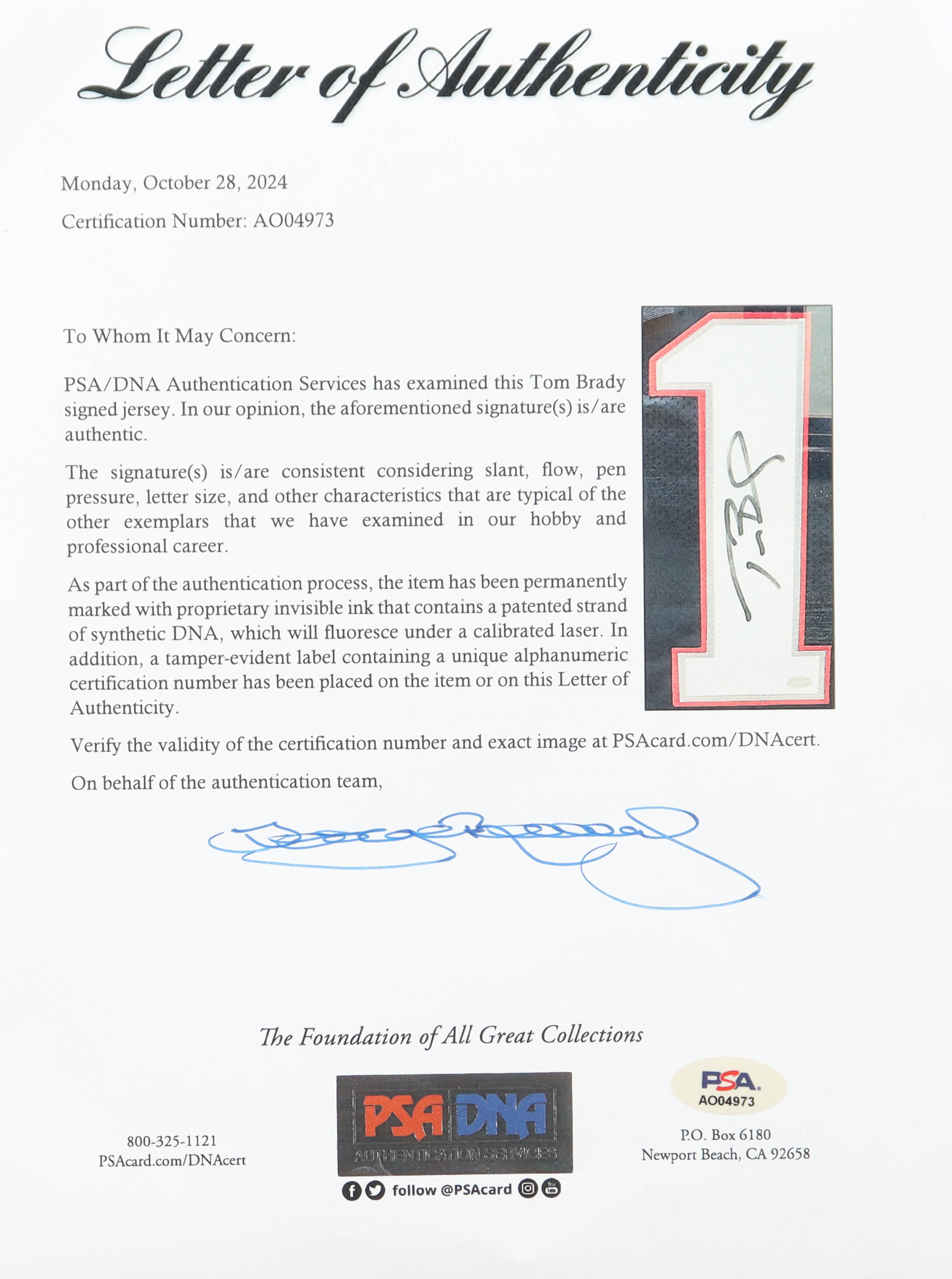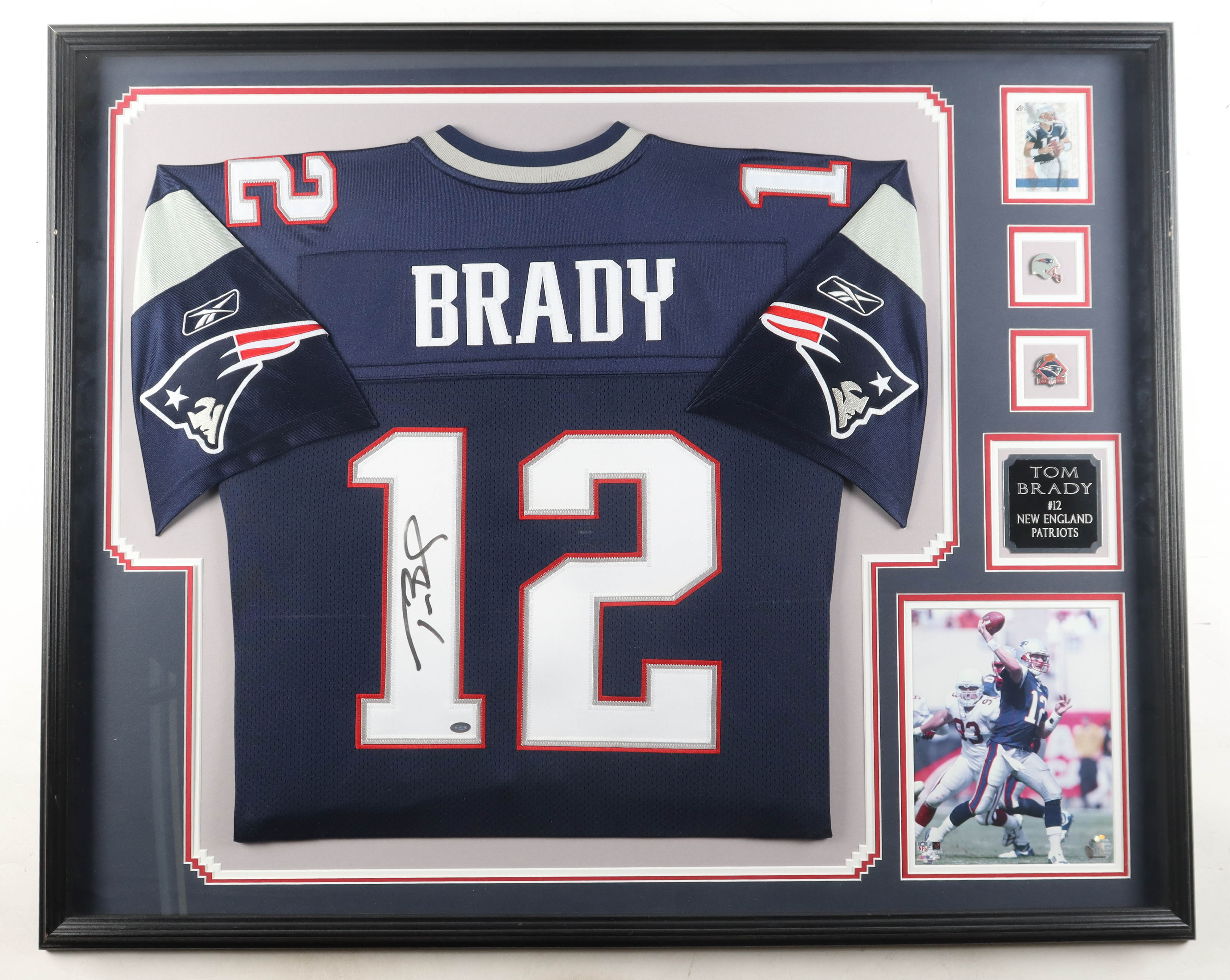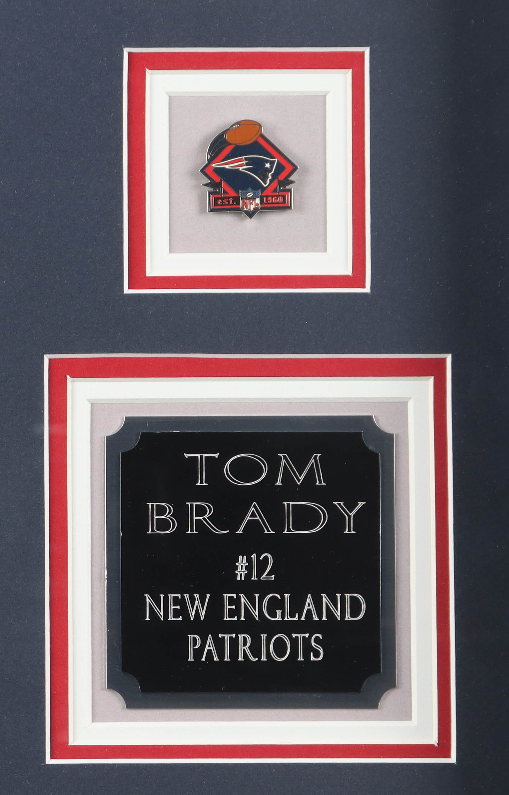 Tom Brady Signed Patriots Custom Framed Reebok Authentic Jersey with Sports Card & (2) Patriots Logo Pins (Mounted Memories & PSA)