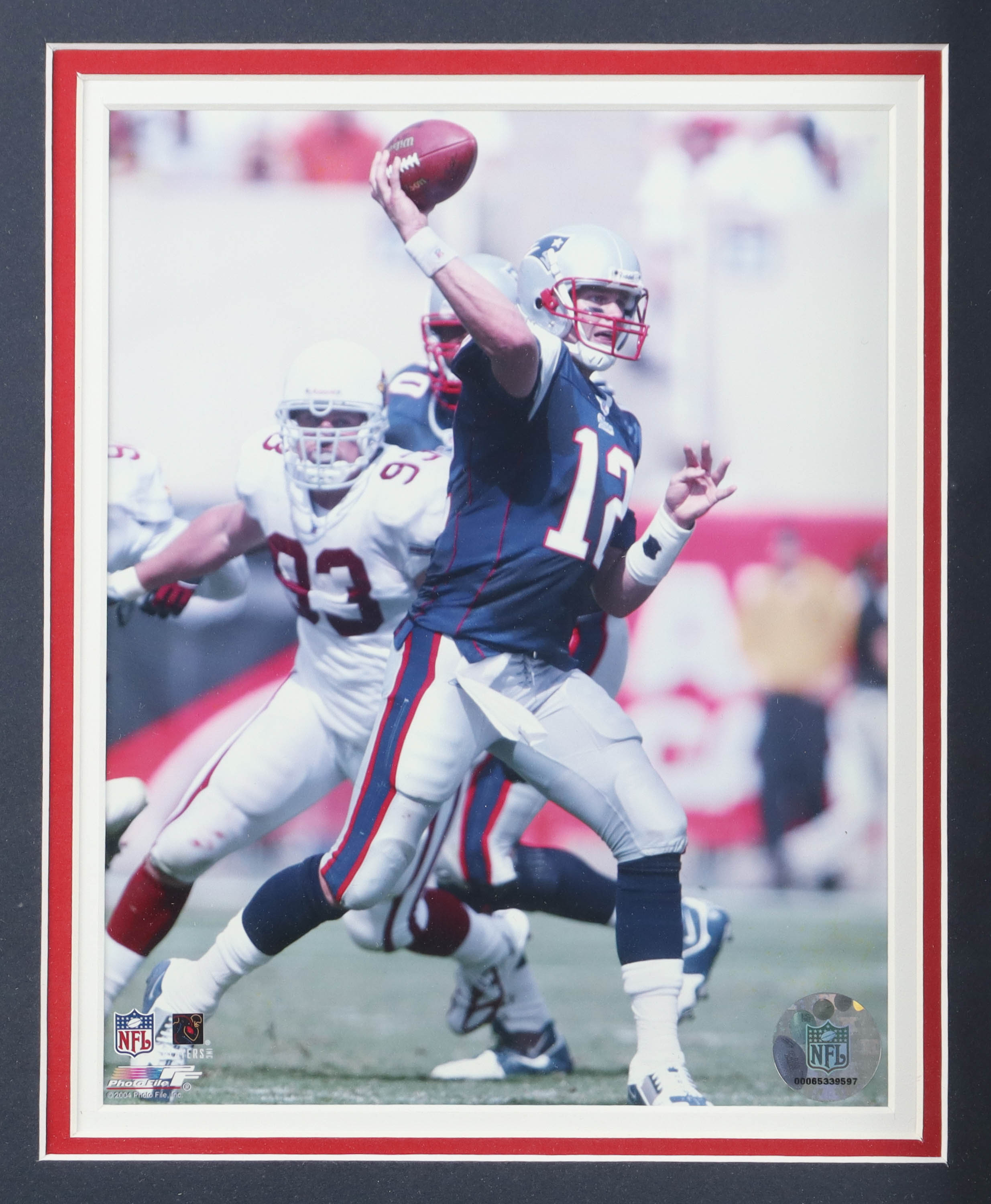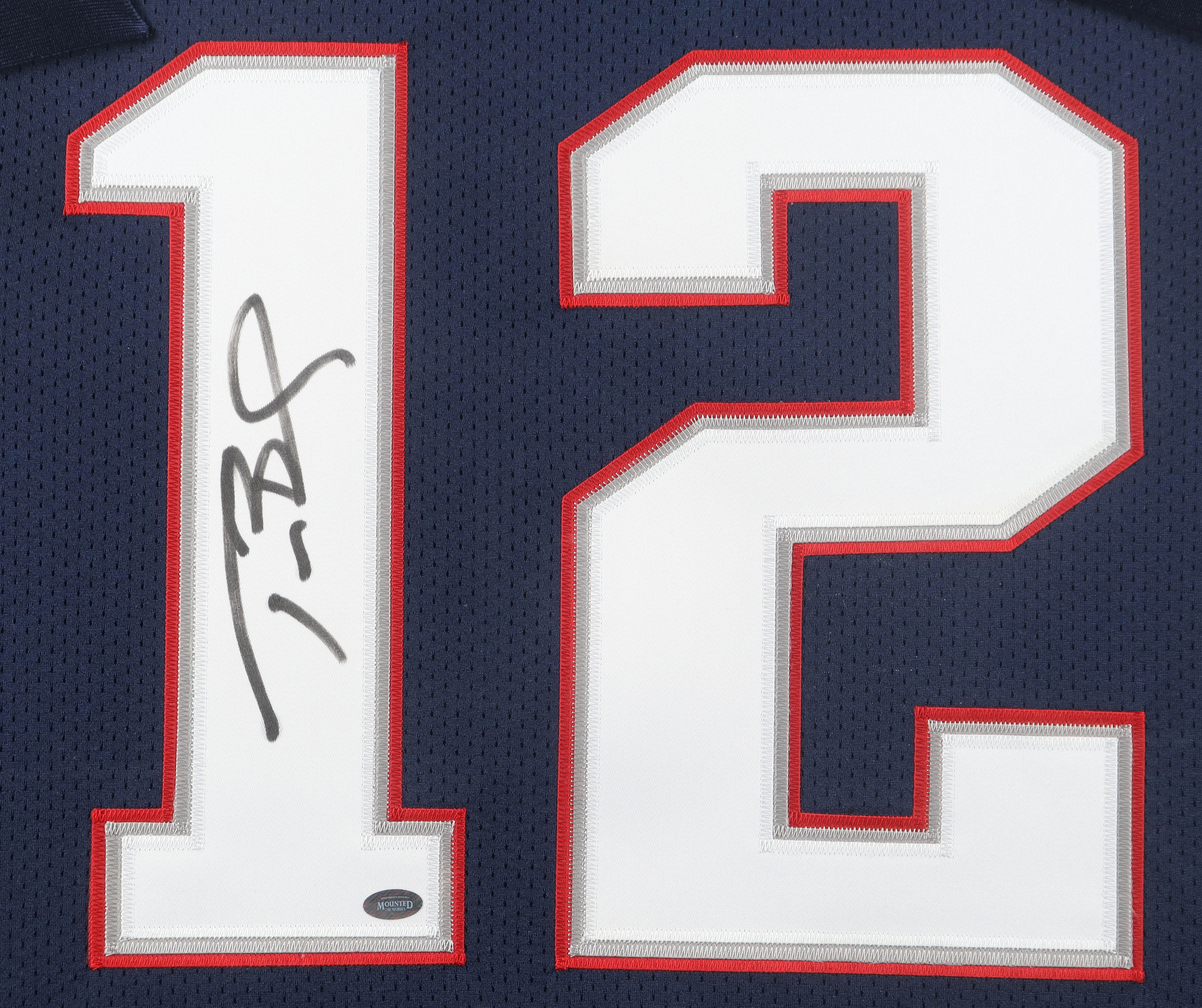Custom frame measures 34" x 40” in size and features a Nike jersey that has been hand-signed by Tom Brady (New England Patriots). Display also features an 8" x 10" photo, (2) New England Patriots Logo pins and a sports card. Please see photos for more details regarding the condition of the item.