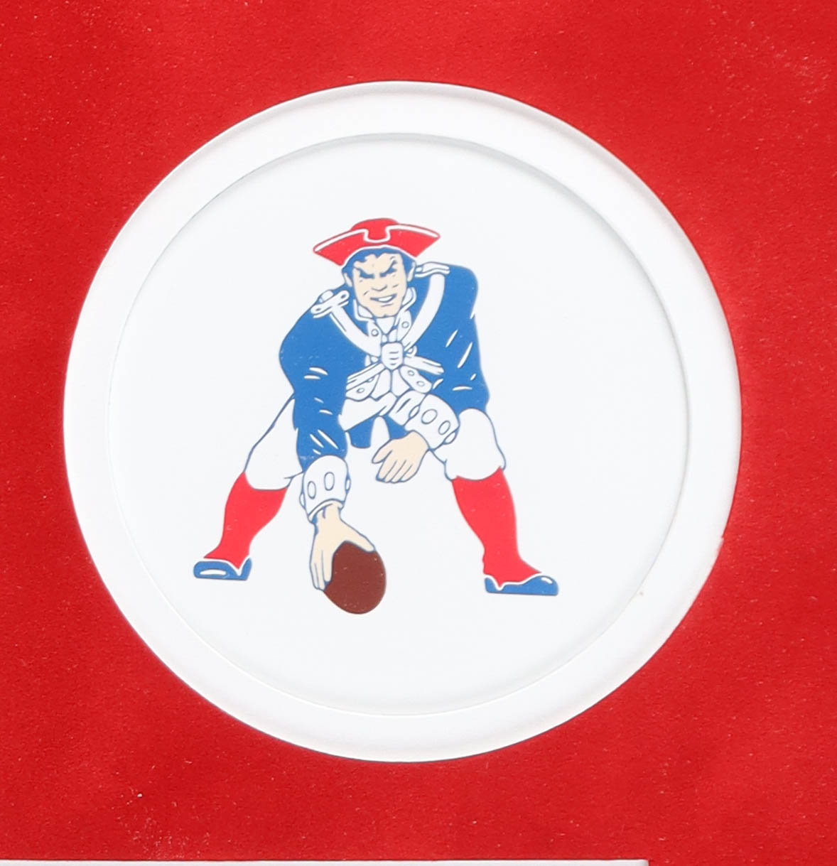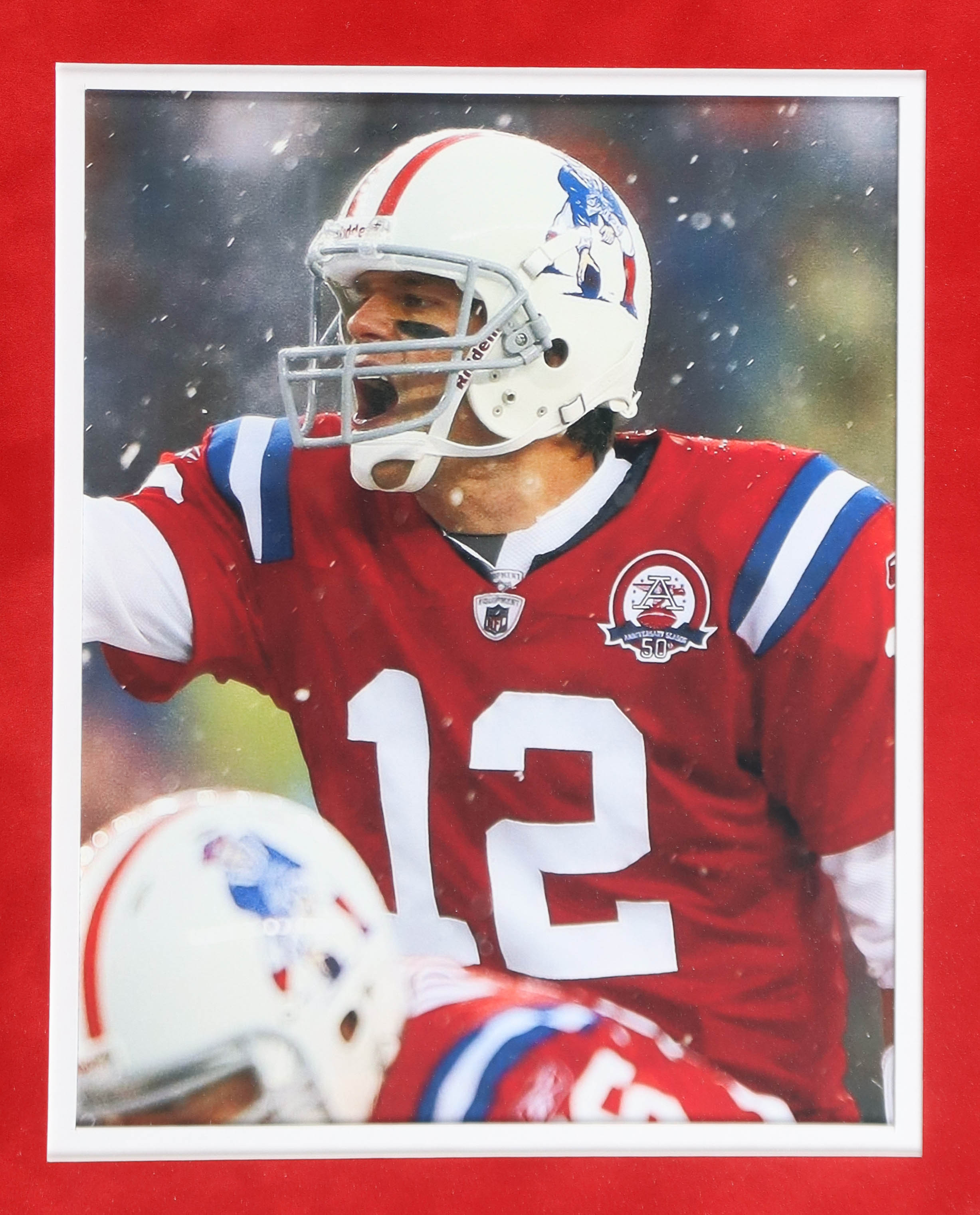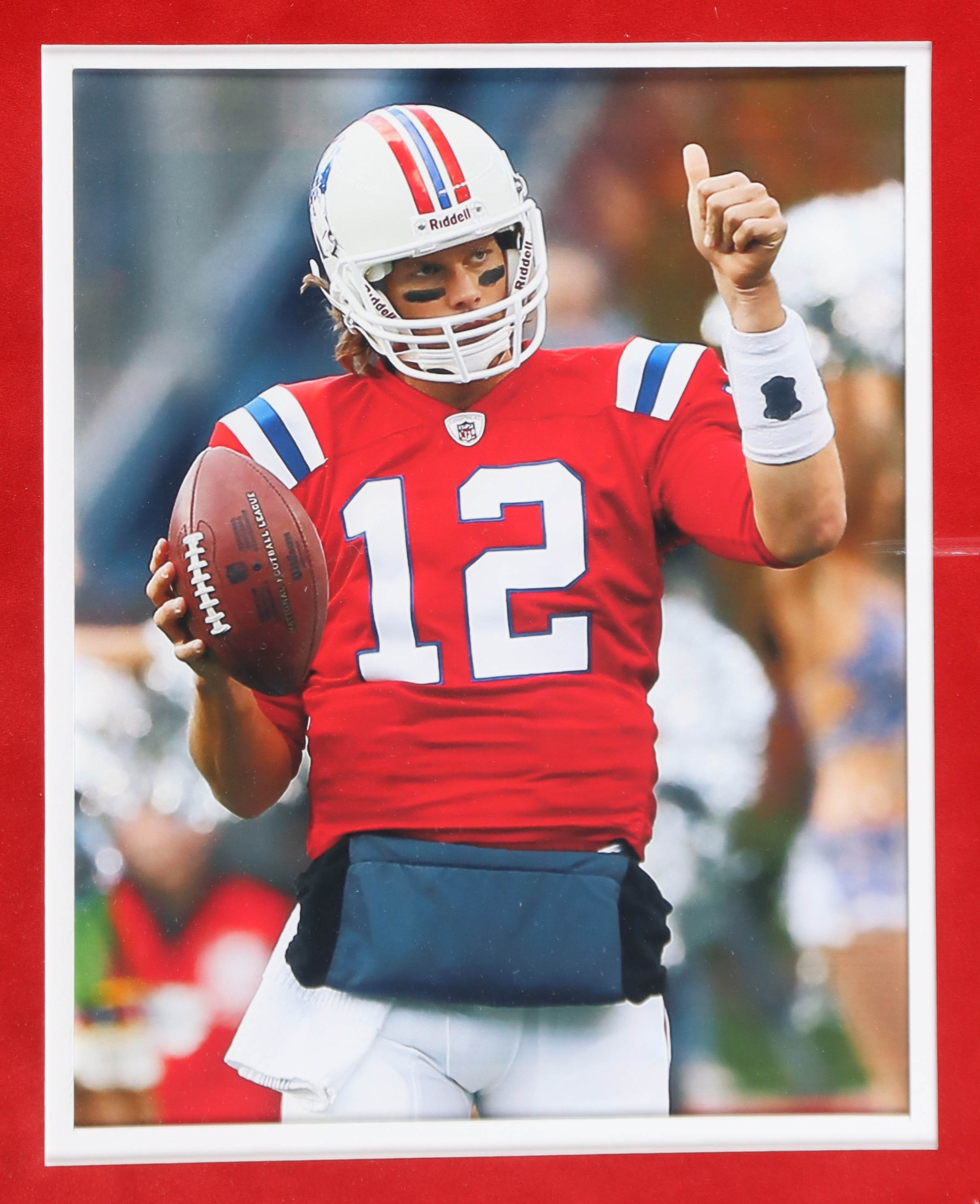 Custom frame measures 43" x 32" in size and features a Nike jersey that has been hand-signed by Tom Brady (New England Patriots). Display also includes (2) 8" x 10" photos and jumbo Patriots Logo. Please see photos for more details regarding the condition of the item.