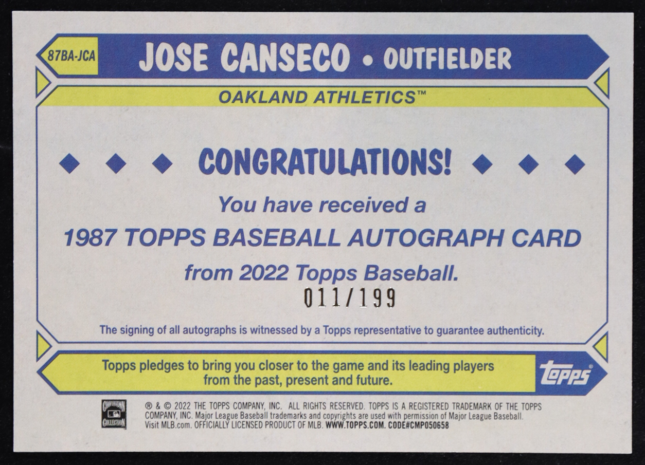 Jose Canseco 2022 Topps '87 Topps Autographs Black #87BAJCA #011/199