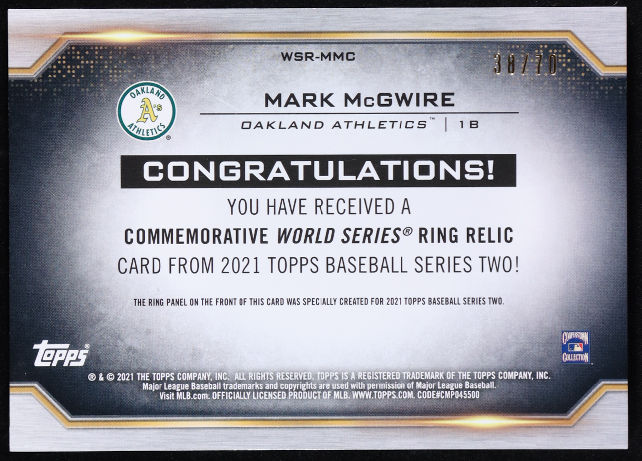 Mark McGwire 2021 Topps Series Two! Commemorative 1989 World Series Ring Relic #WSR-MMC #38/70