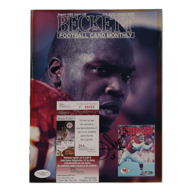 August 1992 Issue #29 of Beckett Football Card Monthly Magazine has been hand-signed by Derrick Thomas (D. 2000, Kansas City Chiefs, HOF).