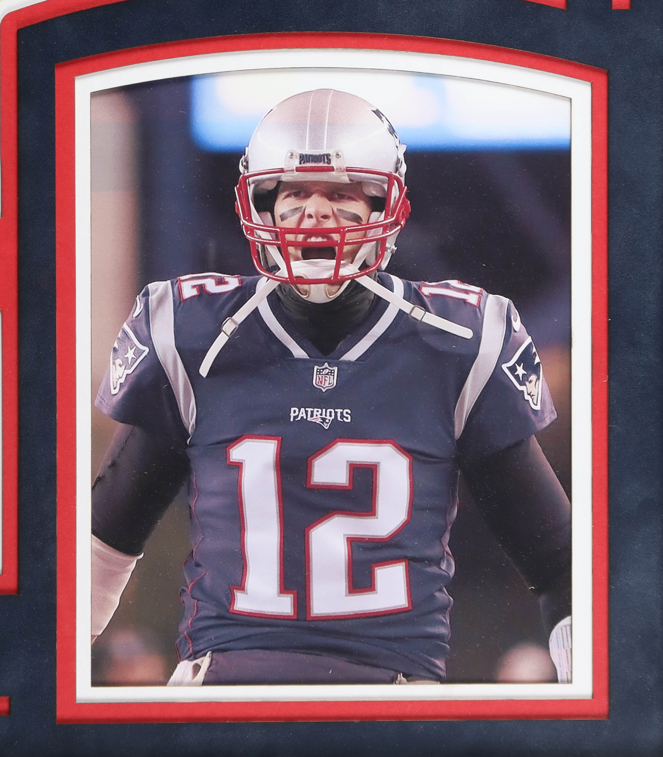 Custom frame measures 32" x 43" in size and features a Nike jersey that has been hand-signed by Tom Brady (New England Patriots). Display also includes (2) 8" x 10" photos and jumbo Patriots Logo. Please see photos for more details regarding the condition of the item.
