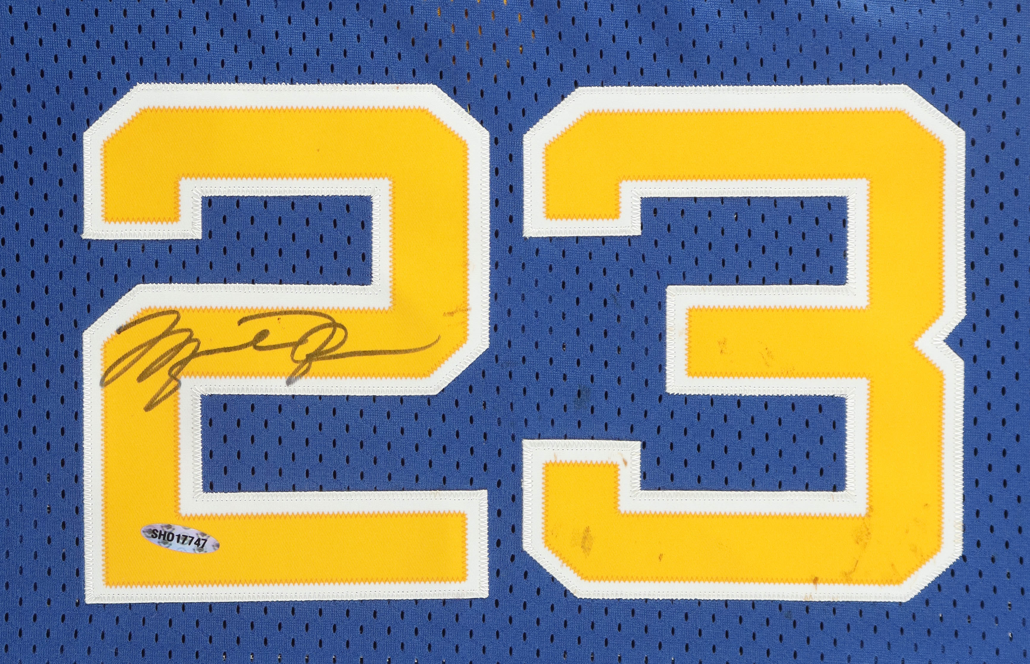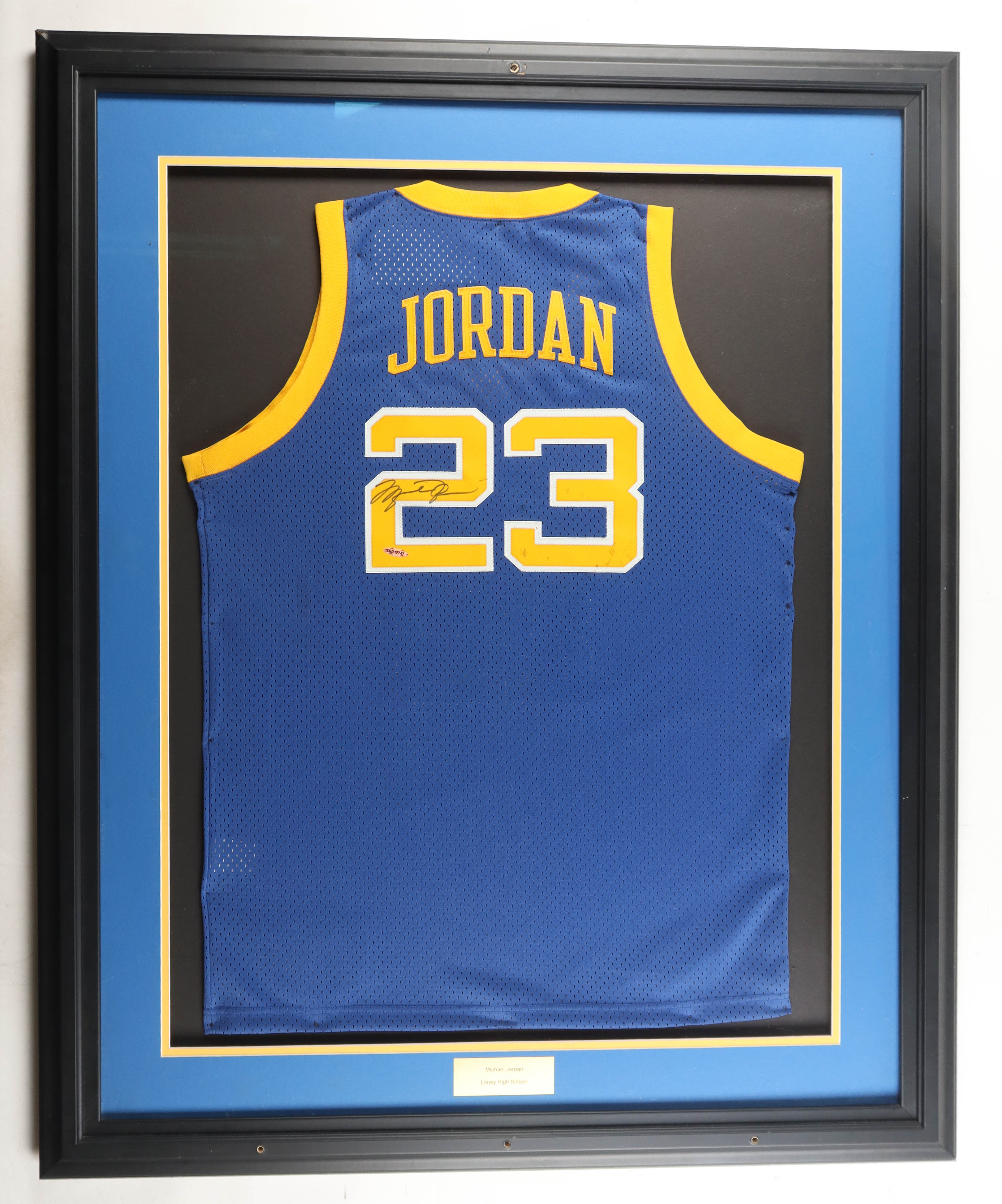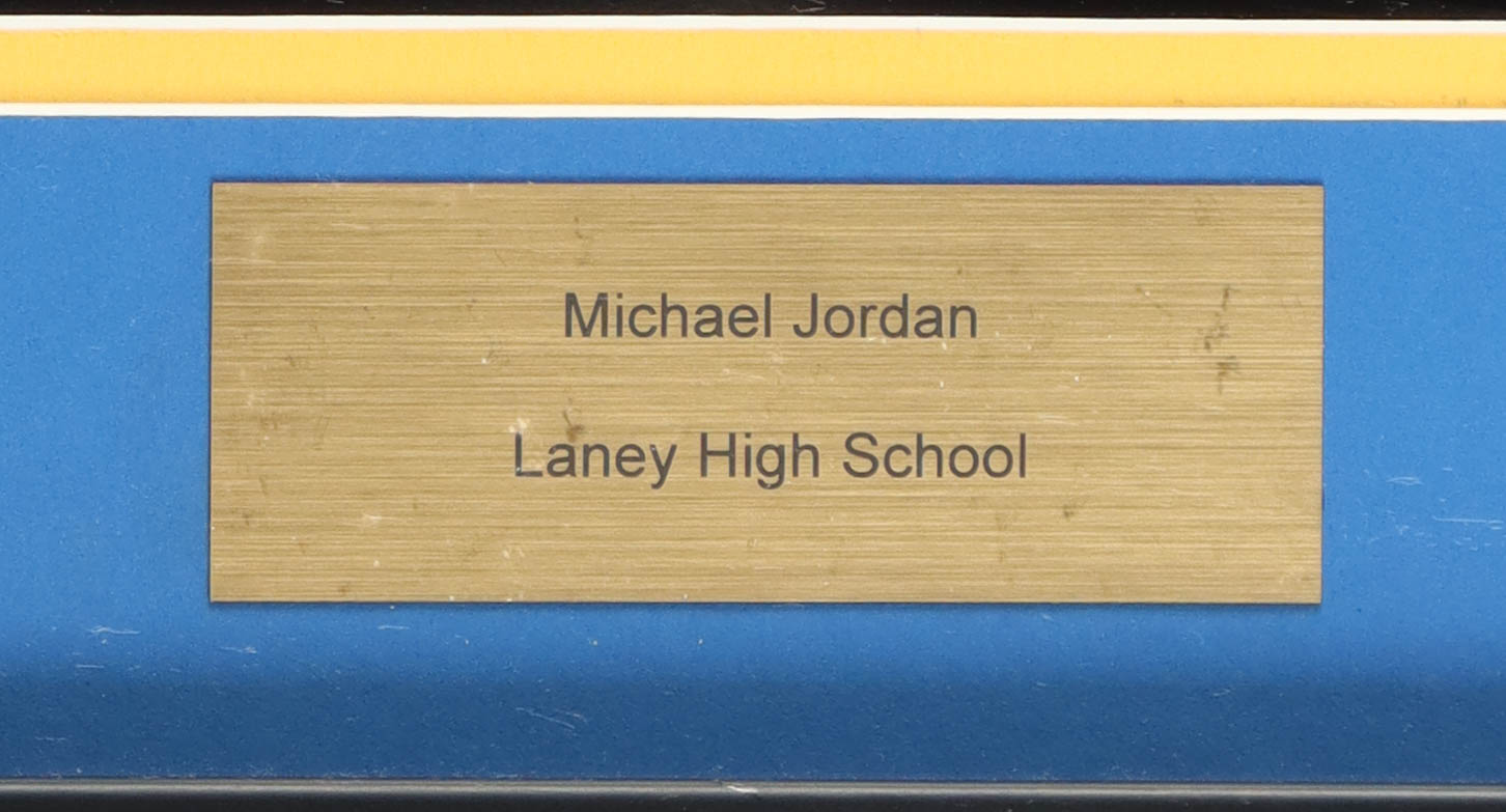 Custom frame measures 34" x 42" in size and features a jersey that has been hand-signed by Michael Jordan (HOF). Display also includes a brass name plate. Please see photos for more details regarding the condition of the item as the frame shows signs of damage.