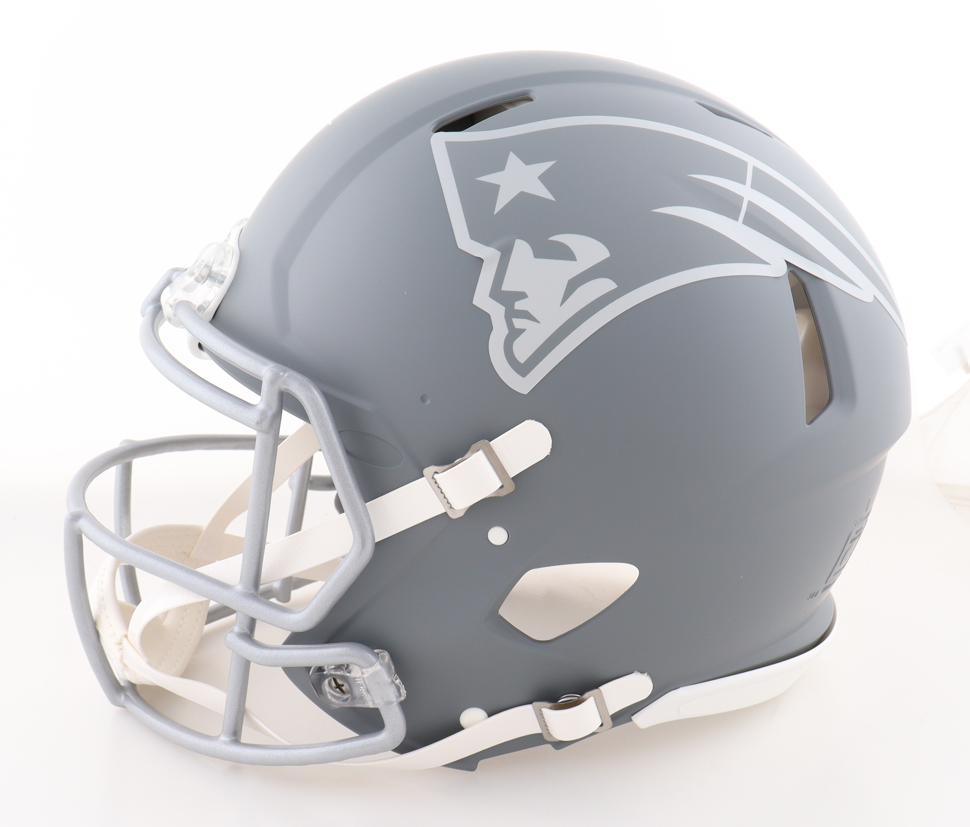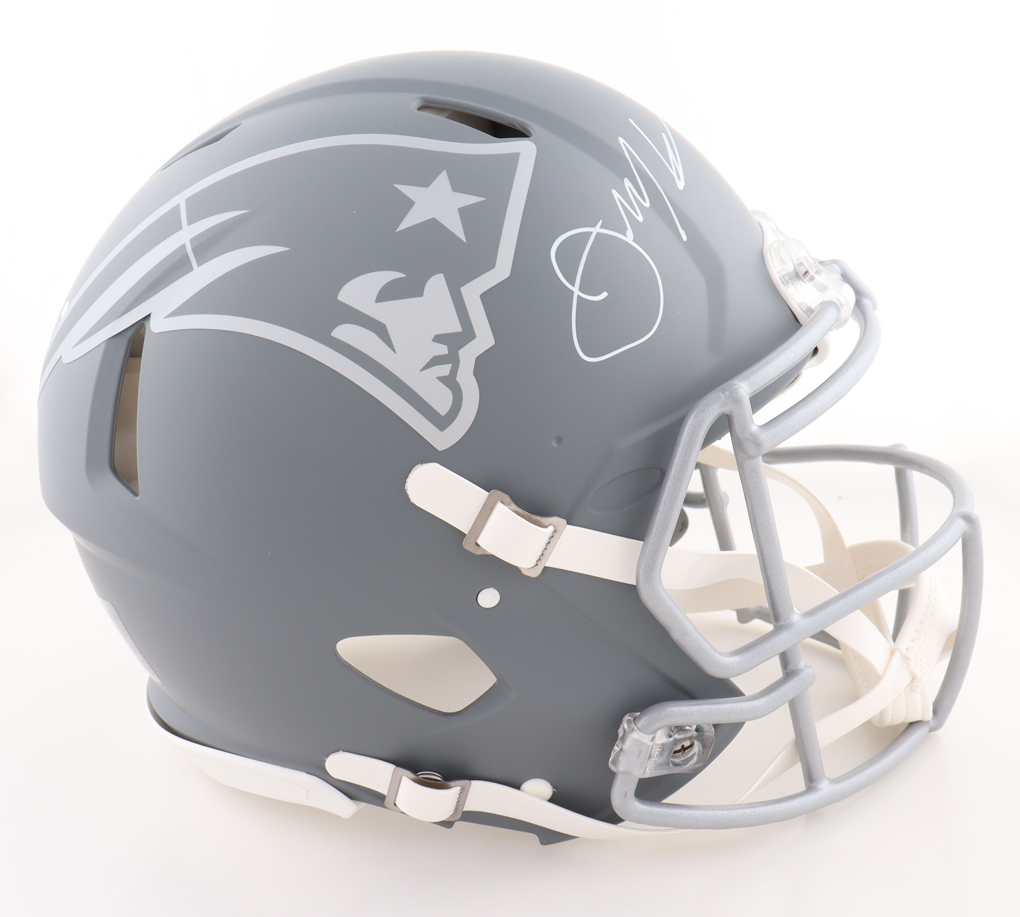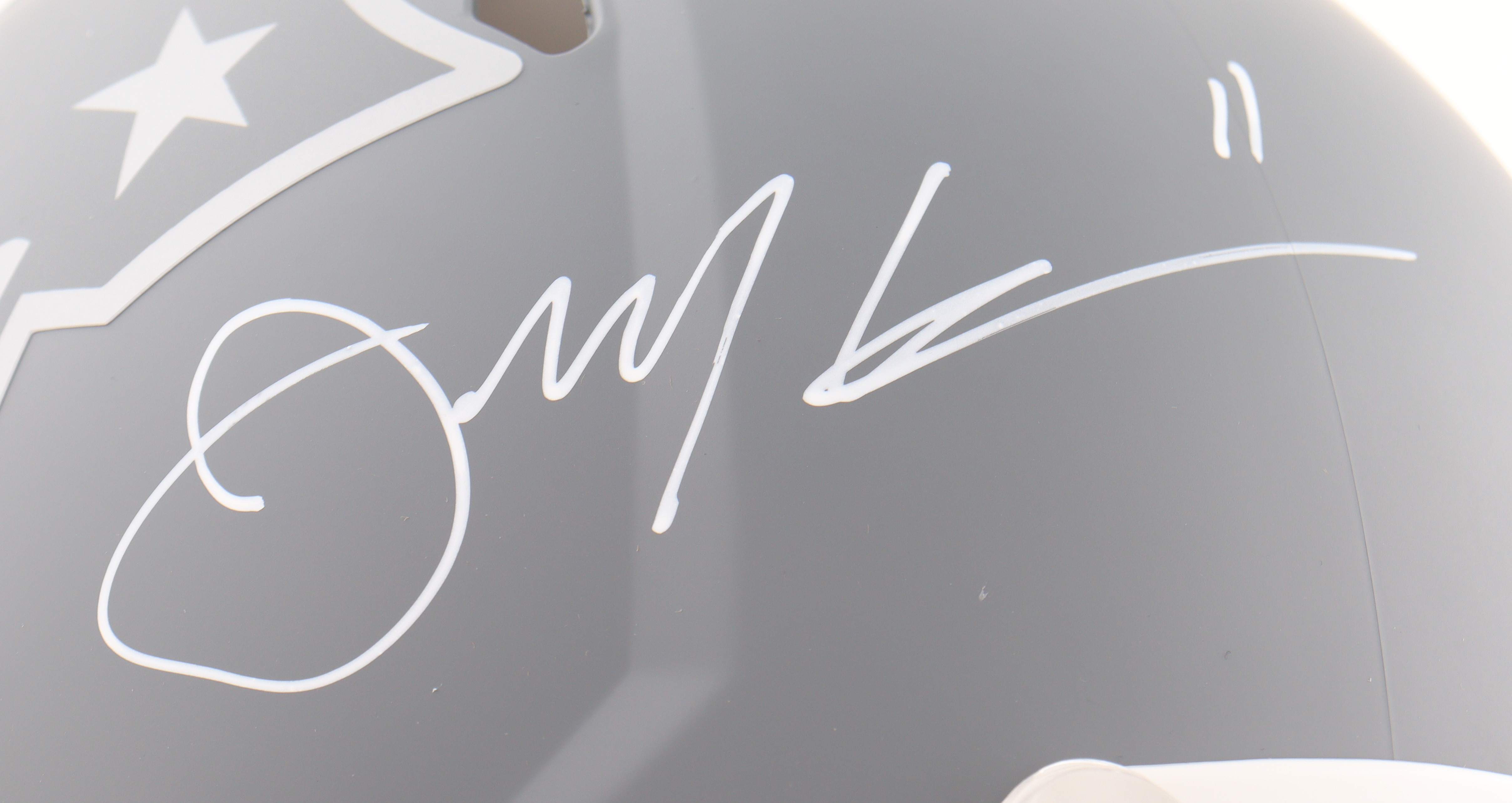 Riddell New England Patriots full-size authentic on-field slate alternate speed helmet. Hand-signed by Julian Edelman.