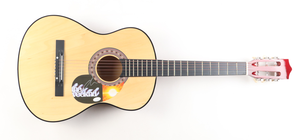 Acoustic guitar measures approximately 38" in length and has been hand-signed by The Weeknd on a CD insert that has been repurposed as the pickguard.
