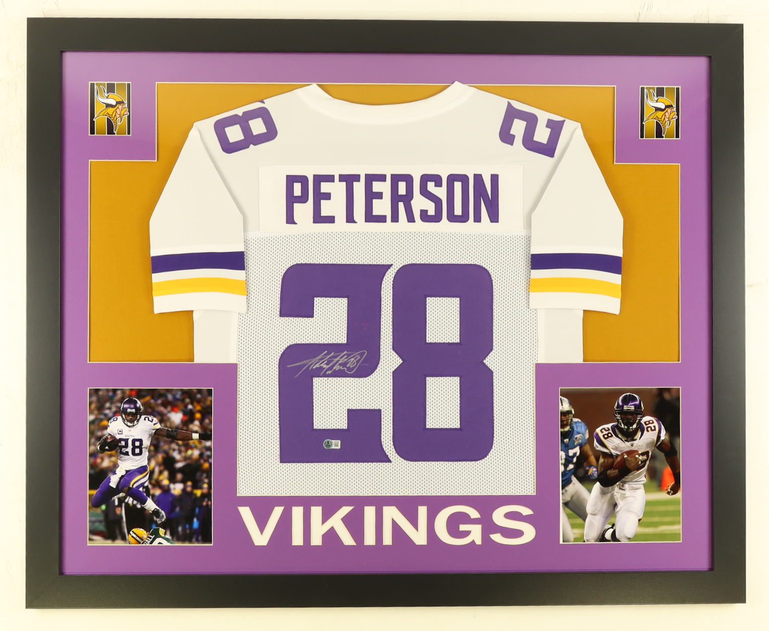 Custom framed display measures approximately 34" x 44" in size and features a jersey that has been hand-signed by Adrian Peterson. Please note that the 8" x 10" photos may be in reverse order.