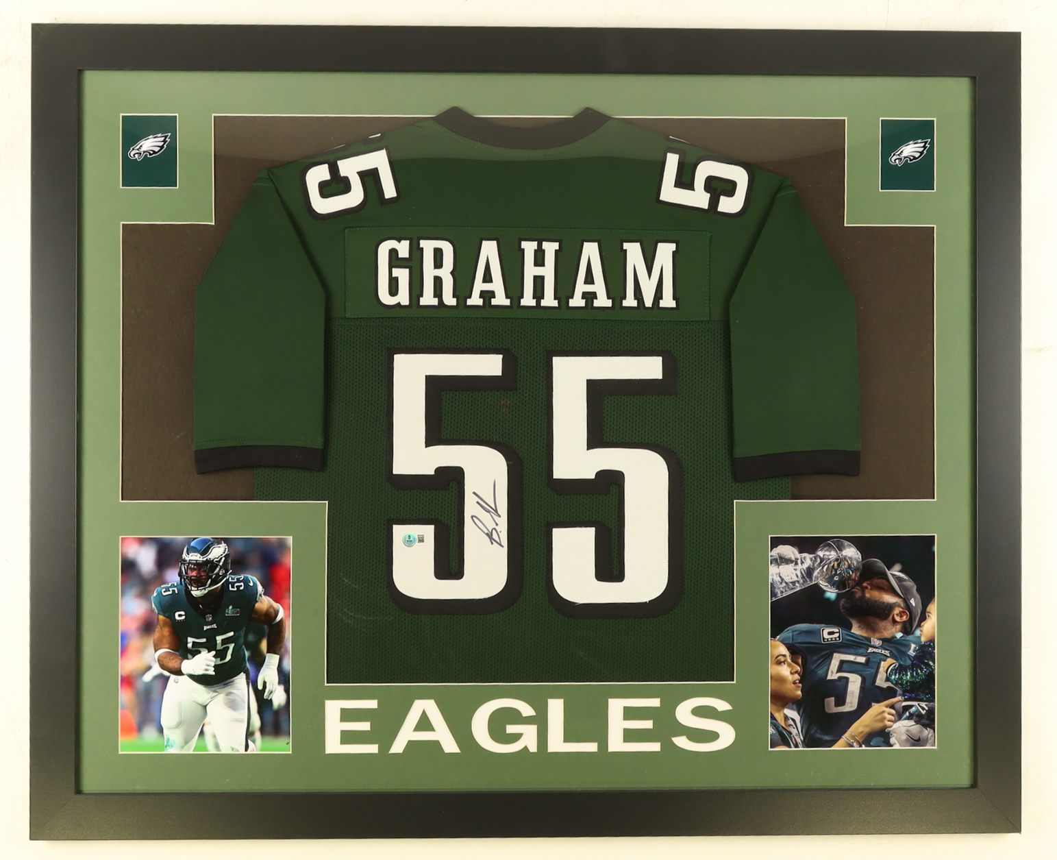Custom framed display measures approximately 35" x 44" in size and features a jersey that has been hand-signed by Brandon Graham. Please note that the 8" x 10" photos may be in reverse order.