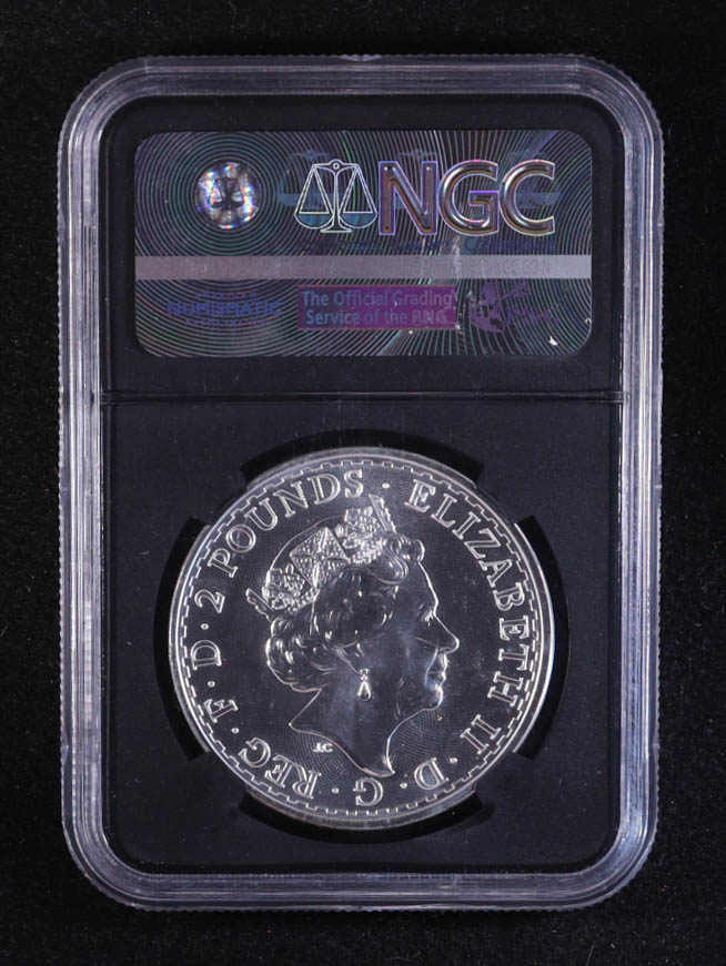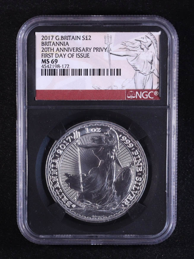 2017 G.Britain £2 Britannia, First Day of Issue, 20th Anniversary Privy 1oz .999 Fine Silver Coin (NGC MS69)