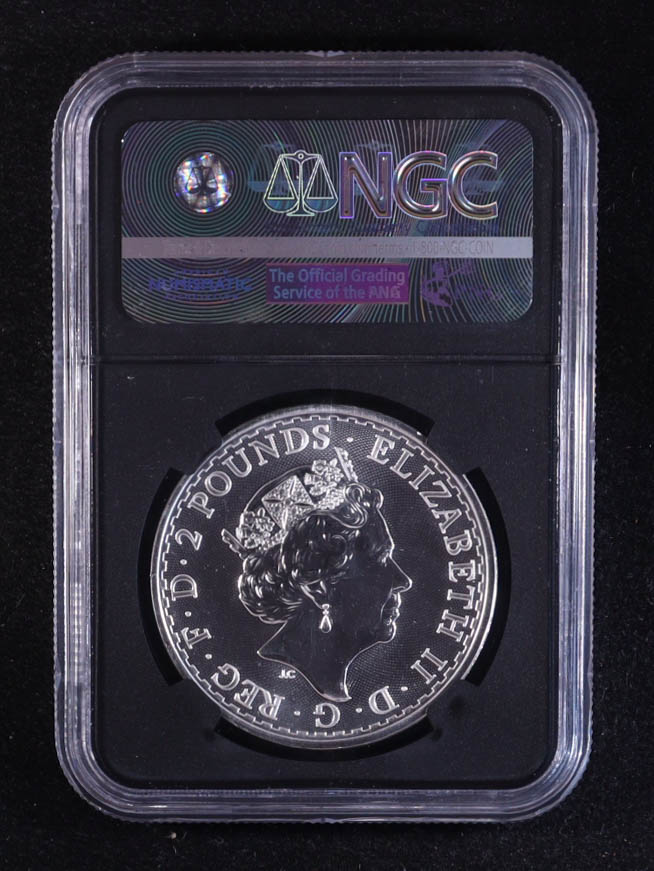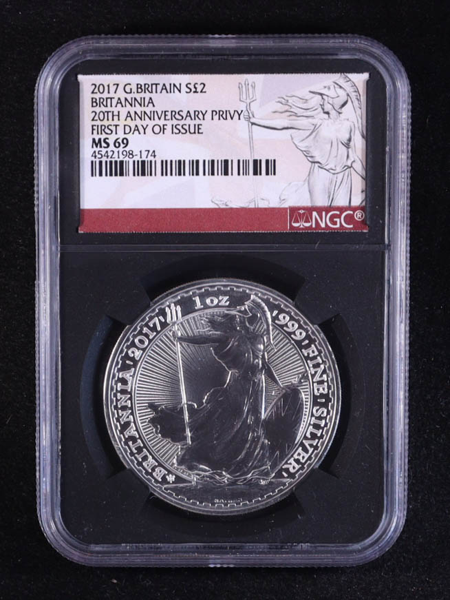 2017 G.Britain £2 Britannia, First Day of Issue, 20th Anniversary Privy - 1oz .999 Fine Silver Coin (NGC MS69)