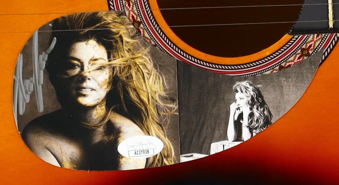 Acoustic guitar measures approximately 38" in length and has been hand-signed on a cut that has been repurposed as the pick-guard by Shania Twain.