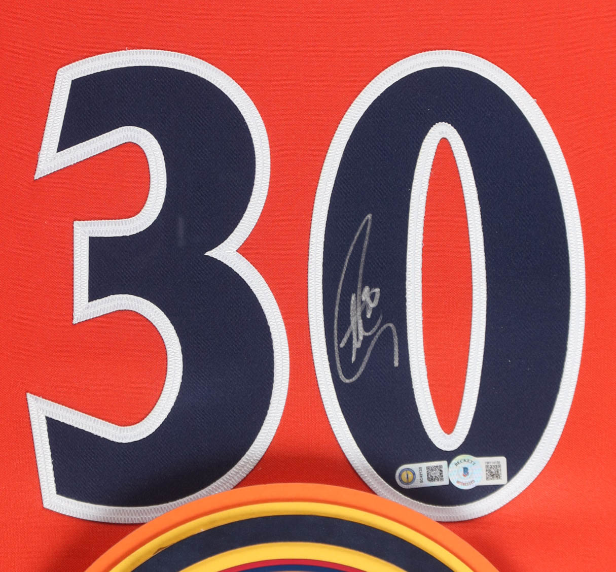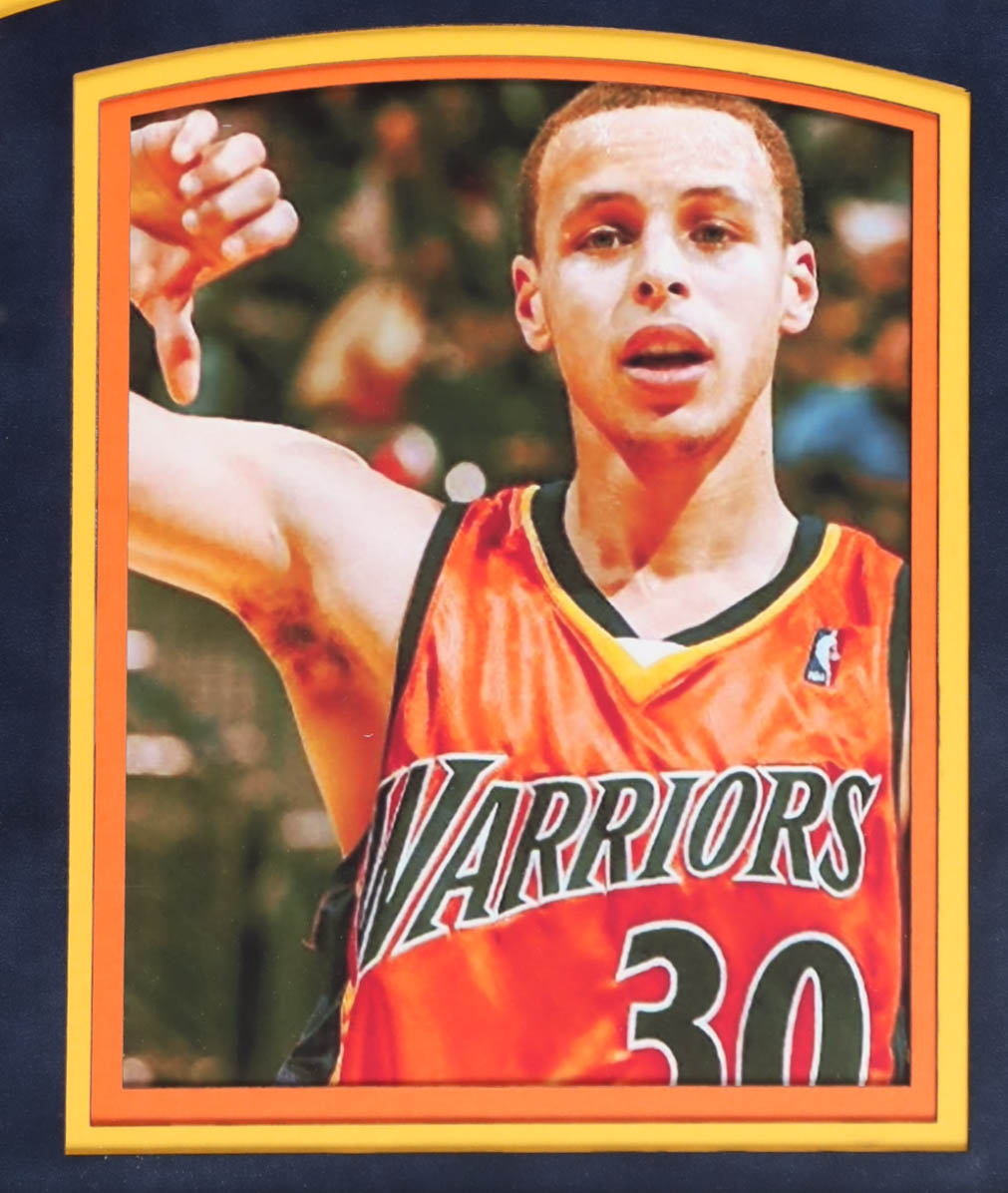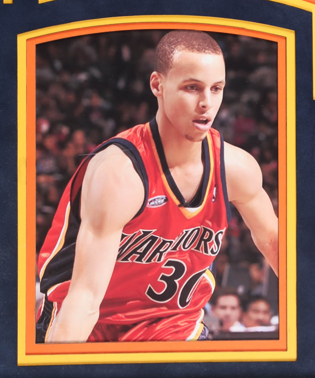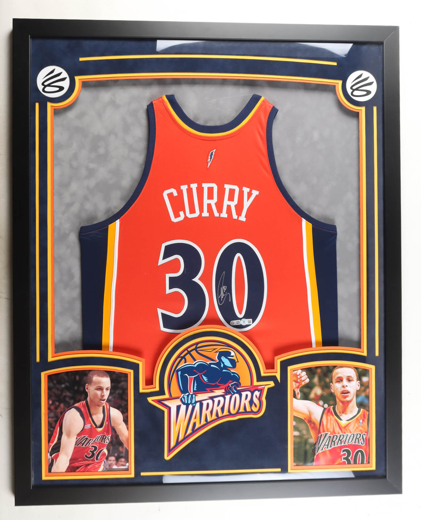 Custom frame measures 32" x 43" in size and features a jersey that has been hand-signed by Steph Curry. Display also includes (2) 8" x 10" photos and jumbo Warriors Logo. Please see photos for more details regarding the condition of the item.