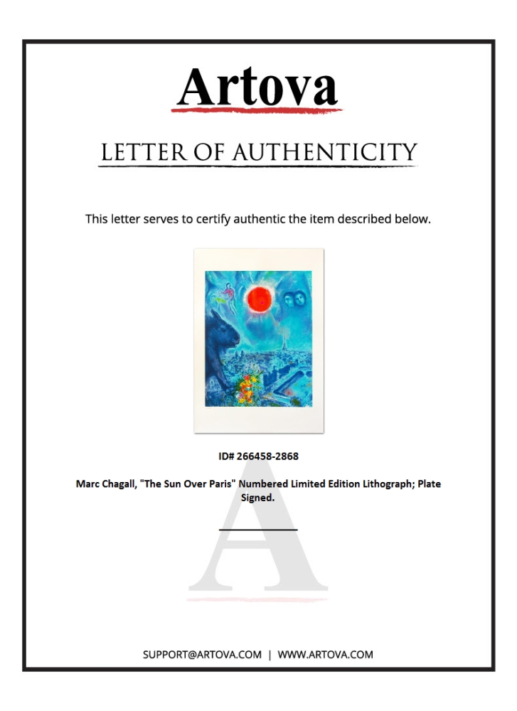 "The Sun Over Paris" is a limited edition lithograph on paper by Marc Chagall (1887-1985). Printed by Atelier Mourlot in Paris and authorized by the Chagall Estate and ADAGP Paris , the piece is plate signed and comes with a certificate of authenticity. Measures approximately 30" x 23.5" (image).