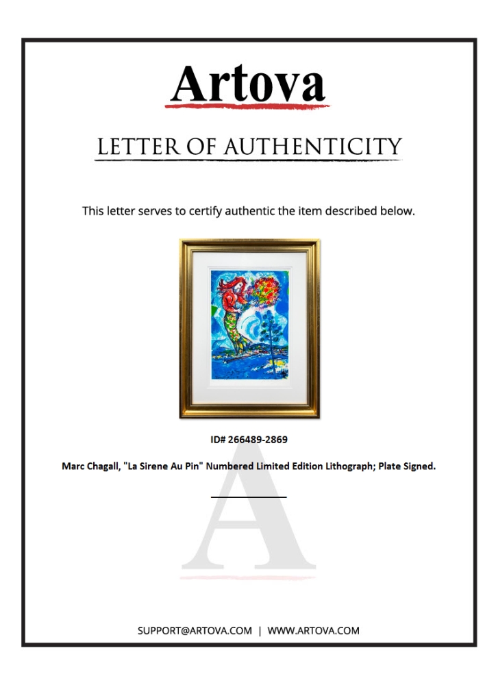 "La Sirene Au Pin" is a framed limited edition lithograph on paper by Marc Chagall (1887-1985). Printed by Atelier Tete a Tete in Paris and authorized by the Chagall Estate and ADAGP Paris , the piece is plate signed and comes with a certificate of authenticity. Measures approximately 25.5" x 23.5" (frame), 15" x 11" (image).