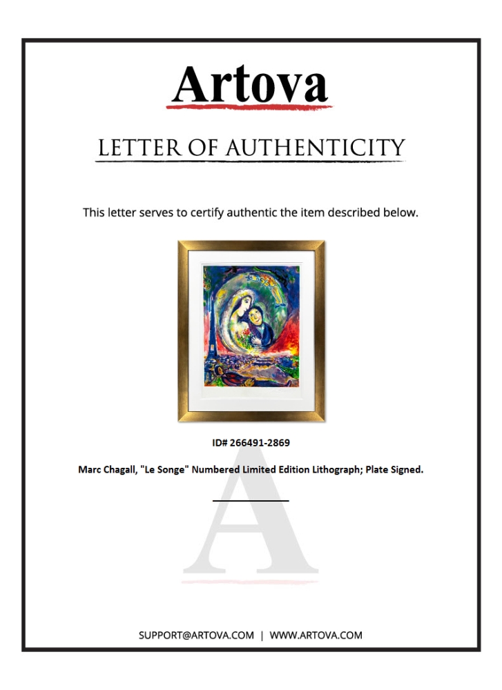 "Le Songe" is a framed limited edition lithograph on paper by Marc Chagall (1887-1985). Printed by Atelier Tete a Tete in Paris and authorized by the Chagall Estate and ADAGP Paris , the piece is plate signed and comes with a certificate of authenticity. Measures approximately 25" x 23" (frame), 14.5" x 11.5" (image).