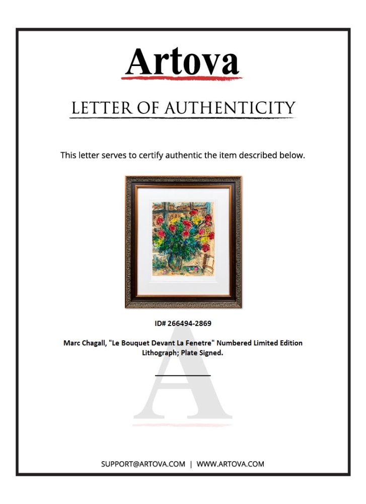 "Le Bouquet Devant La Fenetre" is a framed limited edition lithograph on paper by Marc Chagall (1887-1985). Printed by Atelier Tete a Tete in Paris and authorized by the Chagall Estate and ADAGP Paris , the piece is plate signed and comes with a certificate of authenticity. Measures approximately 31" x 29" (frame), 20.5" x 16.5" (image).