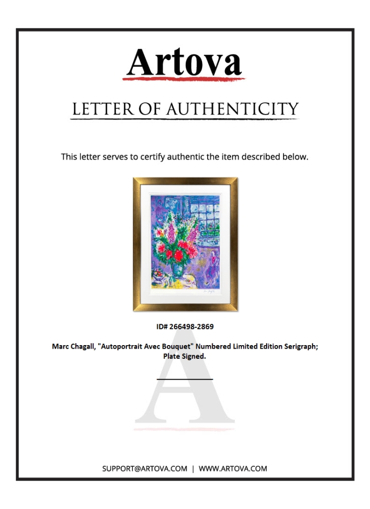 "Autoportrait Avec Bouquet" is a framed limited edition serigraph on paper by Marc Chagall (1887-1985). Authorized by the Chagall Estate and ADAGP Paris , the piece is plate signed and comes with a certificate of authenticity. Measures approximately 38.5" x 36.5" (frame), 28" x 21" (image).