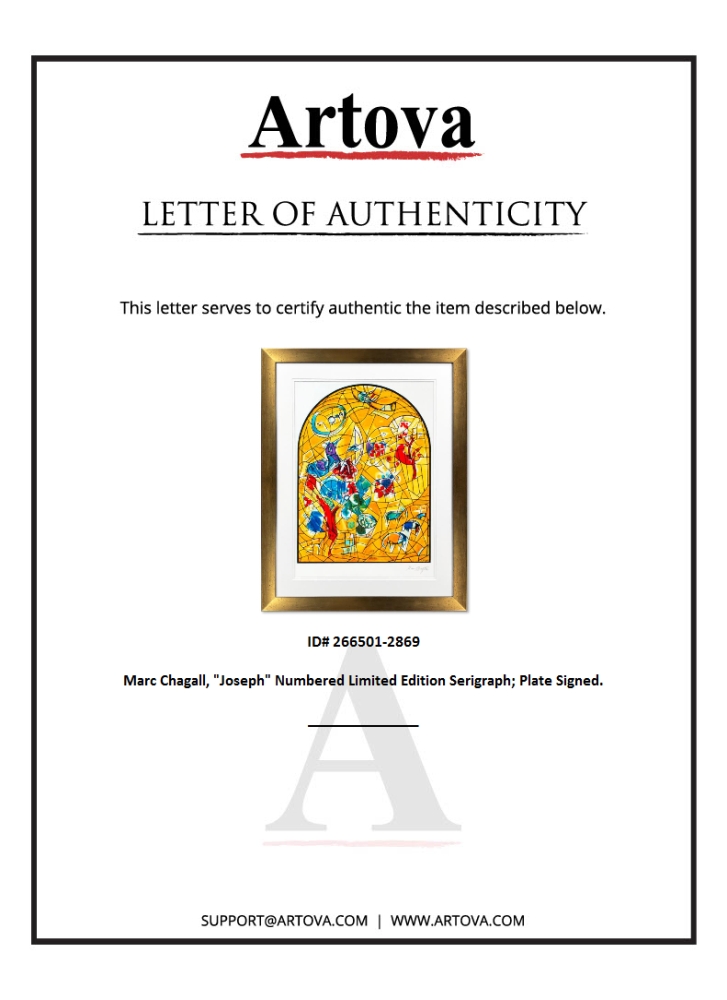 "Joseph" is a framed limited edition serigraph on paper by Marc Chagall (1887-1985). Authorized by the Chagall Estate and ADAGP Paris , the piece is plate signed and comes with a certificate of authenticity. Measures approximately 38" x 36" (frame), 27.5" x 21" (image).