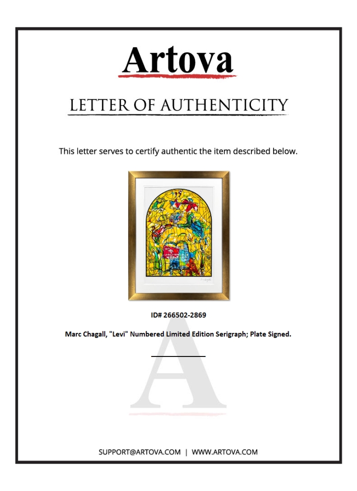 "Levi" is a framed limited edition serigraph on paper by Marc Chagall (1887-1985). Authorized by the Chagall Estate and ADAGP Paris , the piece is plate signed and comes with a certificate of authenticity. Measures approximately 38" x 36" (frame), 27.5" x 21" (image).