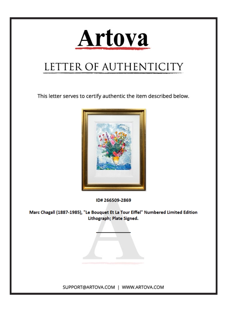 "Le Bouquet Et La Tour Eiffel" is a framed limited edition lithograph on paper by Marc Chagall (1887-1985) authorized by the Chagall Estate and ADAGP Paris. The piece is plate signed and comes with a certificate of authenticity. Measures approximately 24.5" x 22.5" (frame), 14" x 11" (image).