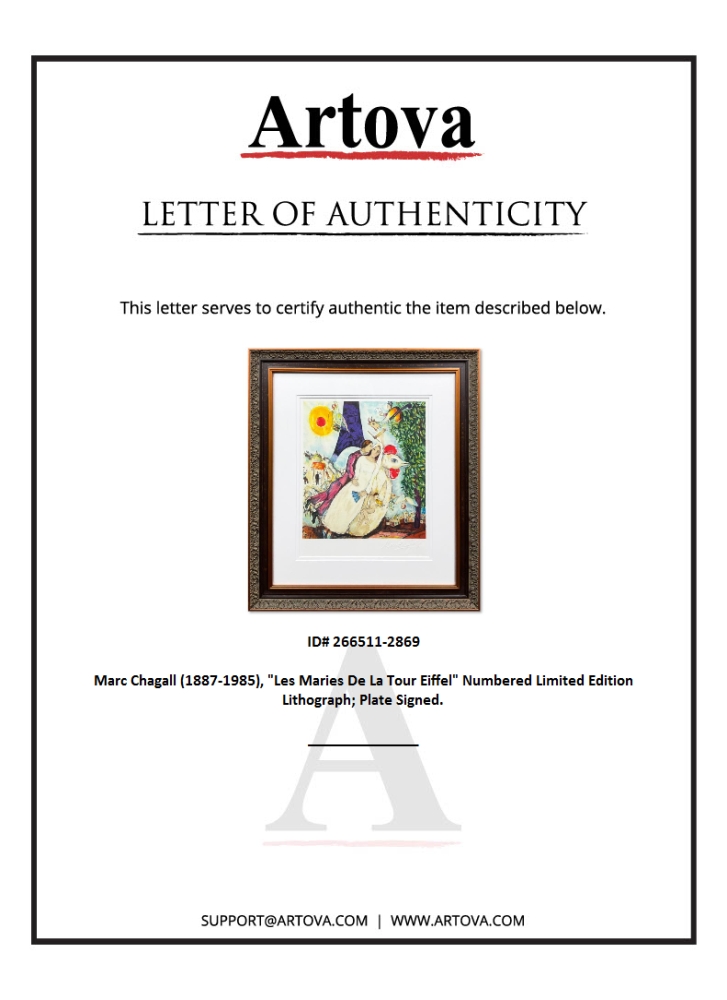 "Les Maries De La Tour Eiffel" is a framed limited edition lithograph on paper by Marc Chagall (1887-1985) authorized by the Chagall Estate and ADAGP Paris. The piece is plate signed and comes with a certificate of authenticity. Measures approximately 22.5" x 20.5" (frame), 12" x 11" (image).