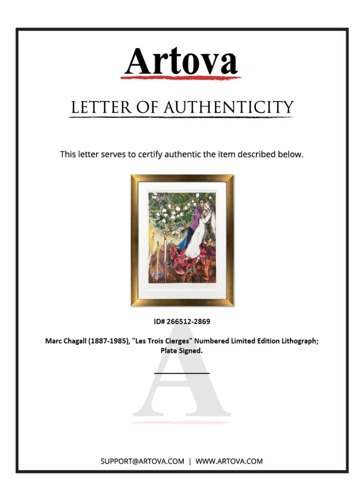"Les Trois Cierges" is a framed limited edition lithograph on paper by Marc Chagall (1887-1985) authorized by the Chagall Estate and ADAGP Paris. The piece is plate signed and comes with a certificate of authenticity. Measures approximately 33" x 31" (frame), 22.5" x 17" (image).