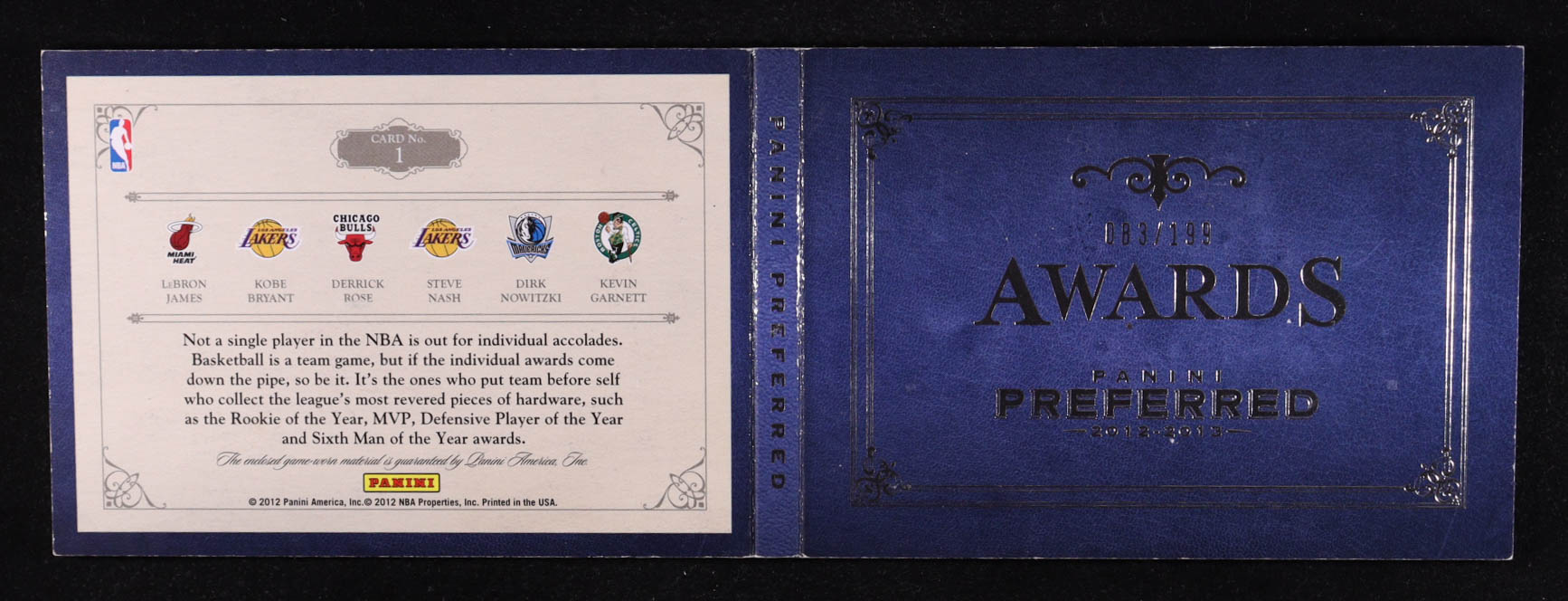 LeBron James / Derrick Rose / Kobe Bryant / Dirk Nowitzki / Steve Nash / Kevin Garnett 2012-13 Panini Preferred Awards Memorabilia #1 #083/199