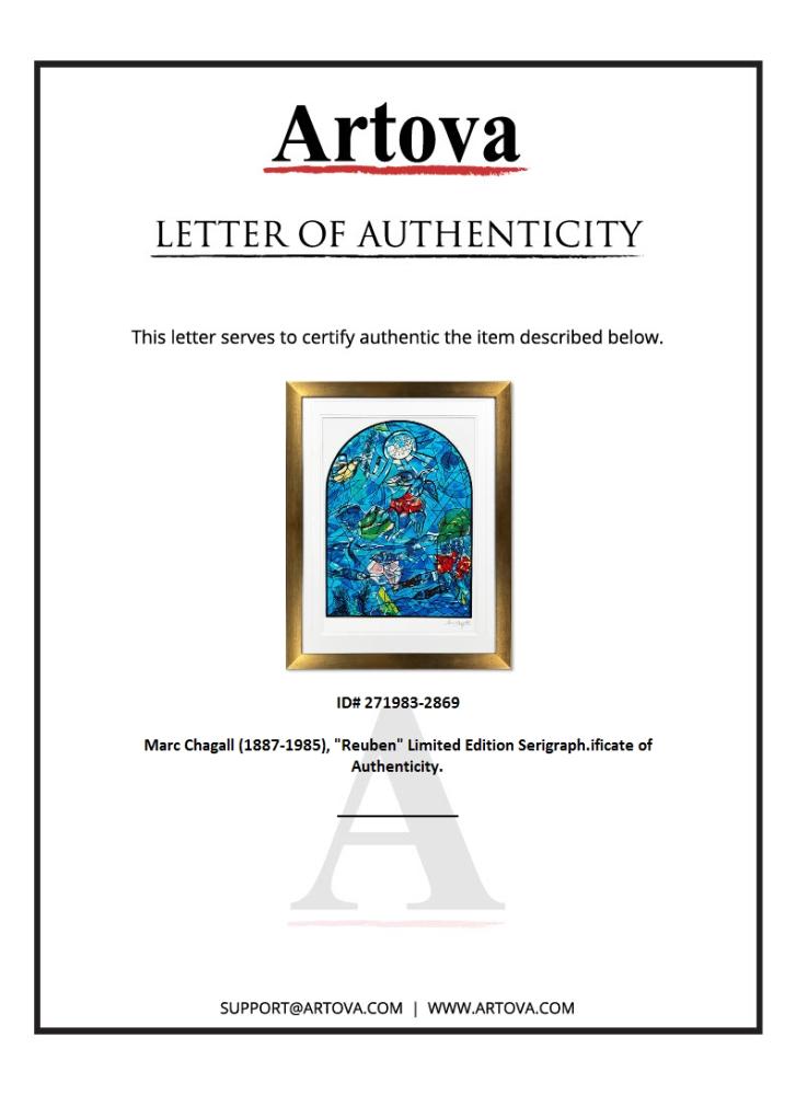 "Reuben" is a framed limited edition serigraph on paper by Marc Chagall (1887-1985). Authorized by the Chagall Estate and ADAGP Paris , the piece is plate signed and comes with a letter of authenticity. Measures approximately 38" x 36" (frame), 27.5" x 21" (image). This item requires special handling and may have a longer than usual turnaround.