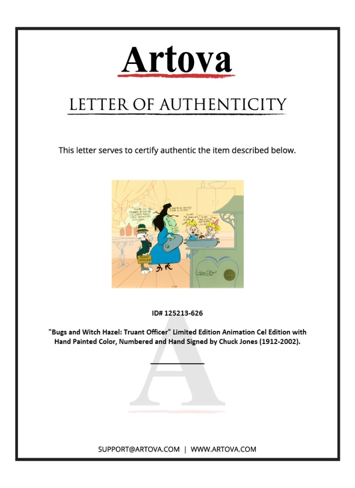 "Bugs and Witch Hazel: Truant Officer" is a limited edition animation cel from a sold out edition with hand painted coloring on sericel outline, that measures approximately 16.5" x 13.5". Hand-signed by Chuck Jones (Artist, D.2002).