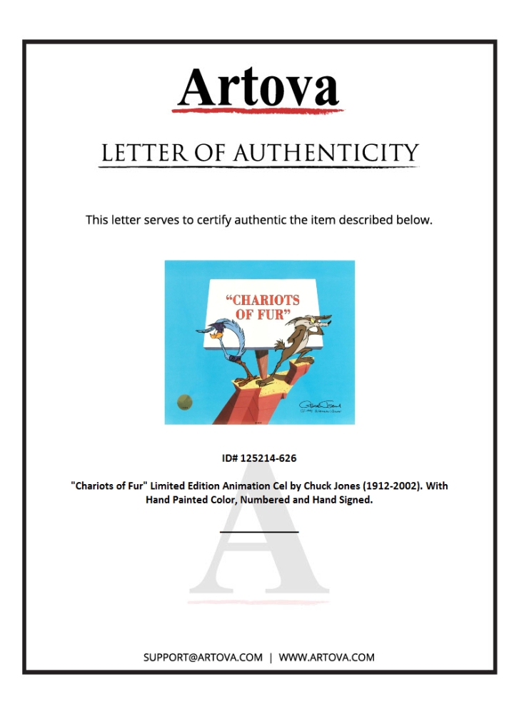 Own this amazing piece based on the original line image hand drawn and hand-inked on paper by Chuck Jones! "Chariots of Fur" is a limited edition animation cel from a sold out edition with hand-painted coloring on sericel outline, numbered and hand-signed by Chuck Jones (1912-2002). Measures approx. 10.5" x 12.5".