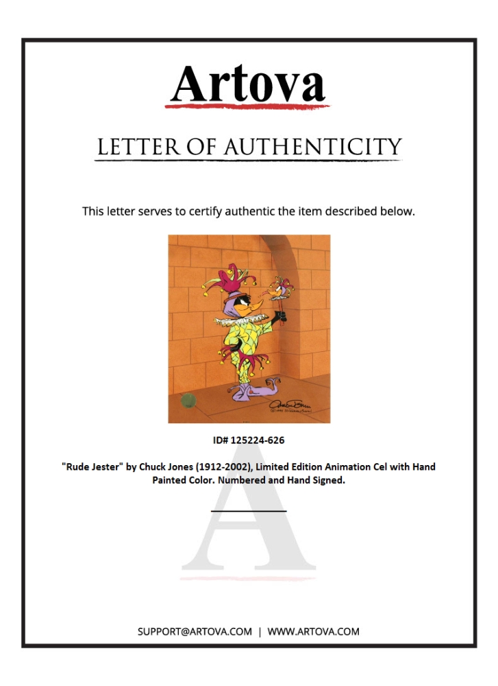 Own this amazing piece based on the original line image hand drawn and hand-inked on paper by Chuck Jones. "Rude Jester" is a sold out limited edition animation cel with hand painted coloring on sericel outline, numbered and hand-signed by Chuck Jones (1912-2002). Measures approximately 10.5" x 12.5".