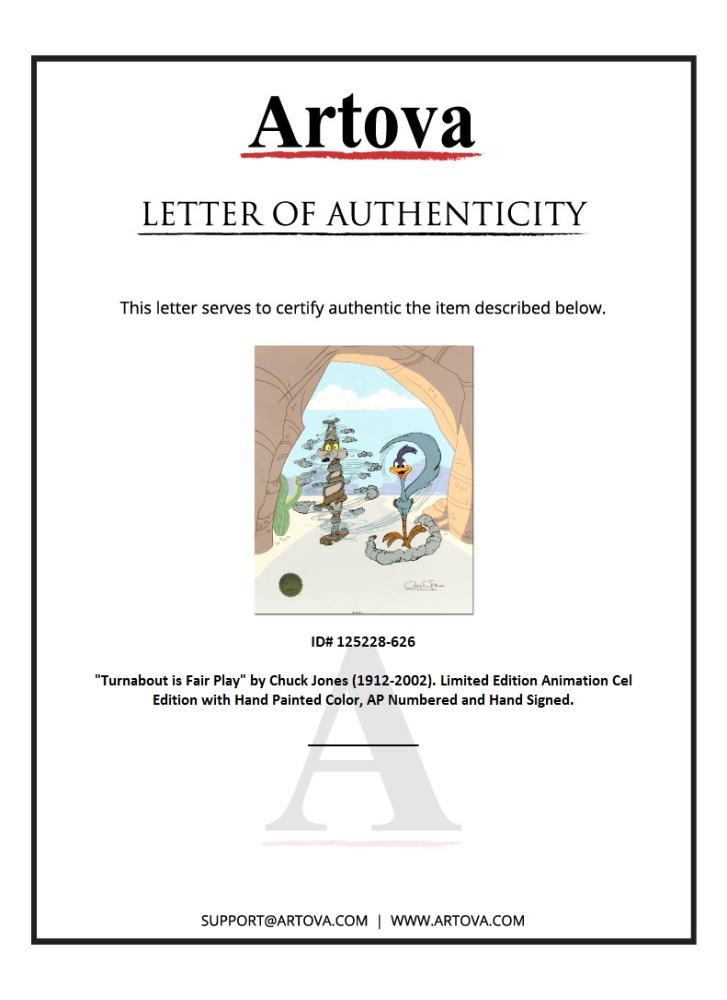 Own this amazing piece based on the original line image hand drawn and hand-inked on paper by Chuck Jones. "Turnabout is Fair Play" is a limited edition animation cel from a sold out edition with hand painted coloring on sericel outline, AP numbered and hand-signed by Chuck Jones (1912-2002). Measures approximately 13.5" x 16.5" (image).