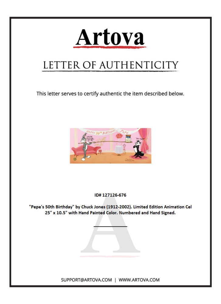 Own this amazing piece based on the original line image hand drawn and hand-inked on paper by Chuck Jones. "Pepe's 50th Birthday" is a sold out limited edition animation cel with hand painted coloring on sericel outline, numbered and hand-signed by Chuck Jones (1912-2002). Measures approximately 10" x 25".