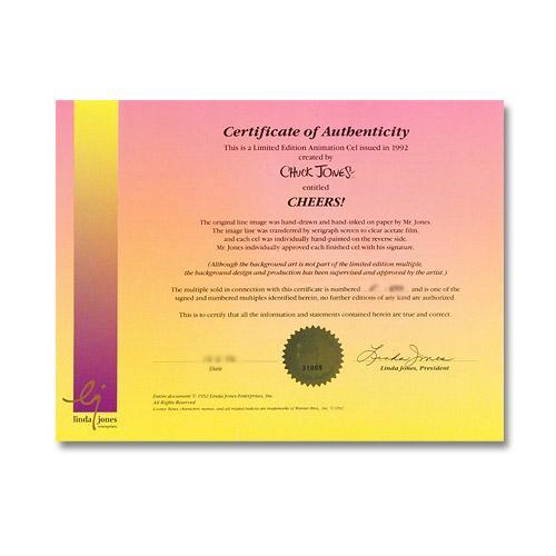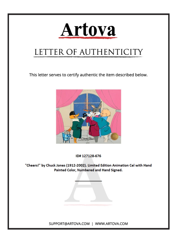 Own this amazing piece based on the original line image hand drawn and hand-inked on paper by Chuck Jones! "Cheers!" is a limited edition animation cel with hand painted coloring on sericel outline, numbered and hand-signed by Chuck Jones (1912-2002). Measures approximately 12.5" x 10.5".