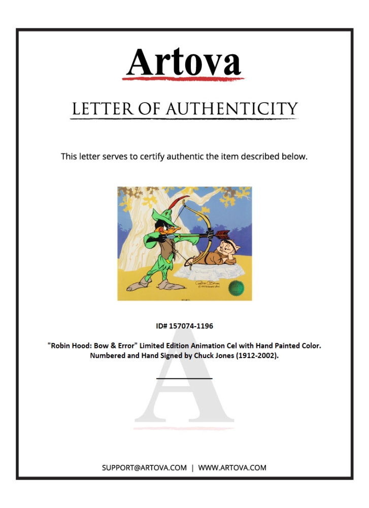 "Robin Hood: Bow & Error" is a limited edition animation cel from a sold out edition with hand-painting color on sericel outline that measures approximately 12.5" x 10.5". Hand-signed by Chuck Jones (Artist, D.2002).