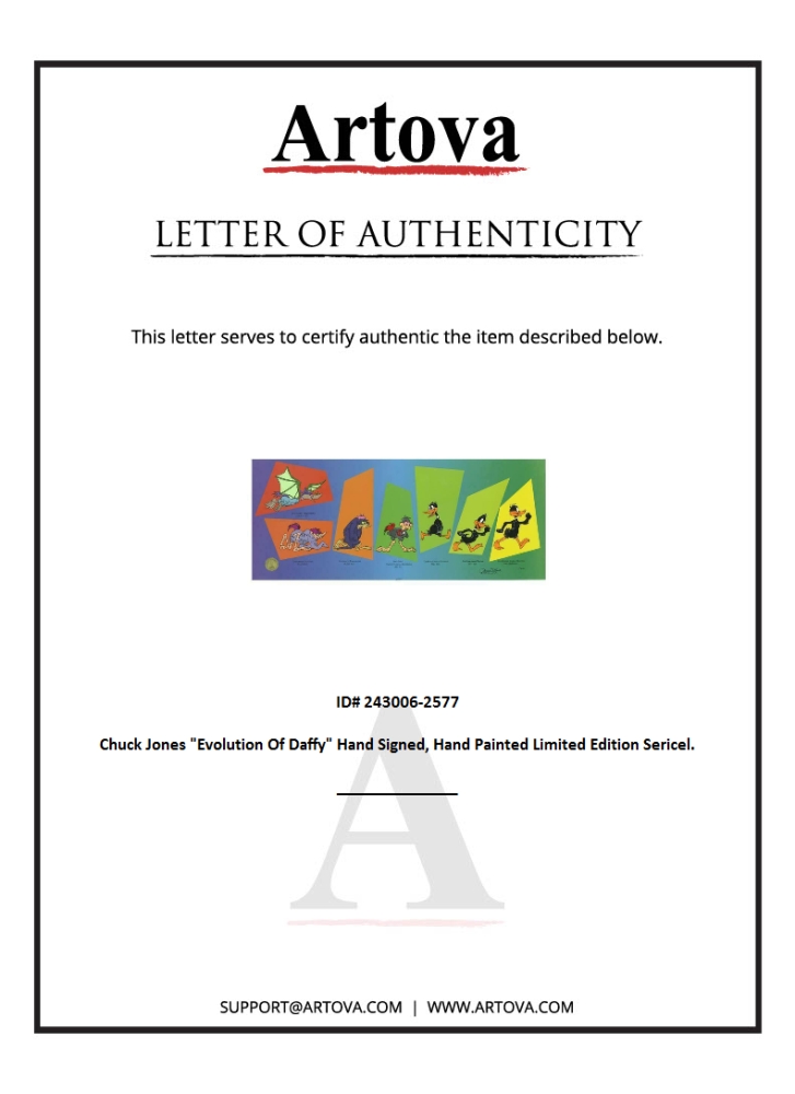 "Evolution Of Daffy" is a limited edition animation cel with hand painted coloring on sericel outline. The piece is numbered, hand-signed by Chuck Jones (1912-2002), and includes a Certificate of Authenticity! Measures Approx: 33" x 13.5"