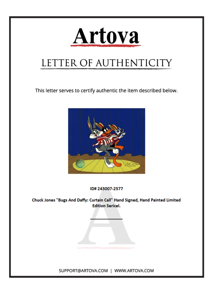 "Bugs And Daffy: Curtain Call" is a limited edition animation cel with hand painted coloring on sericel outline. The piece is numbered, hand-signed by Chuck Jones (1912-2002), and includes a Certificate of Authenticity! Measures Approx: 12.5" x 10.5"