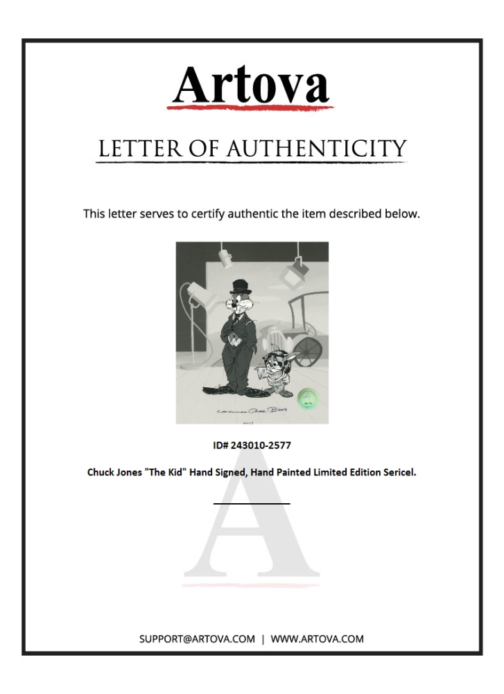 "The Kid" is a limited edition animation cel with hand painted coloring on sericel outline. The piece is numbered, hand-signed by Chuck Jones (1912-2002), and includes a Certificate of Authenticity! Measures Approx: 12.5" x 10.5"