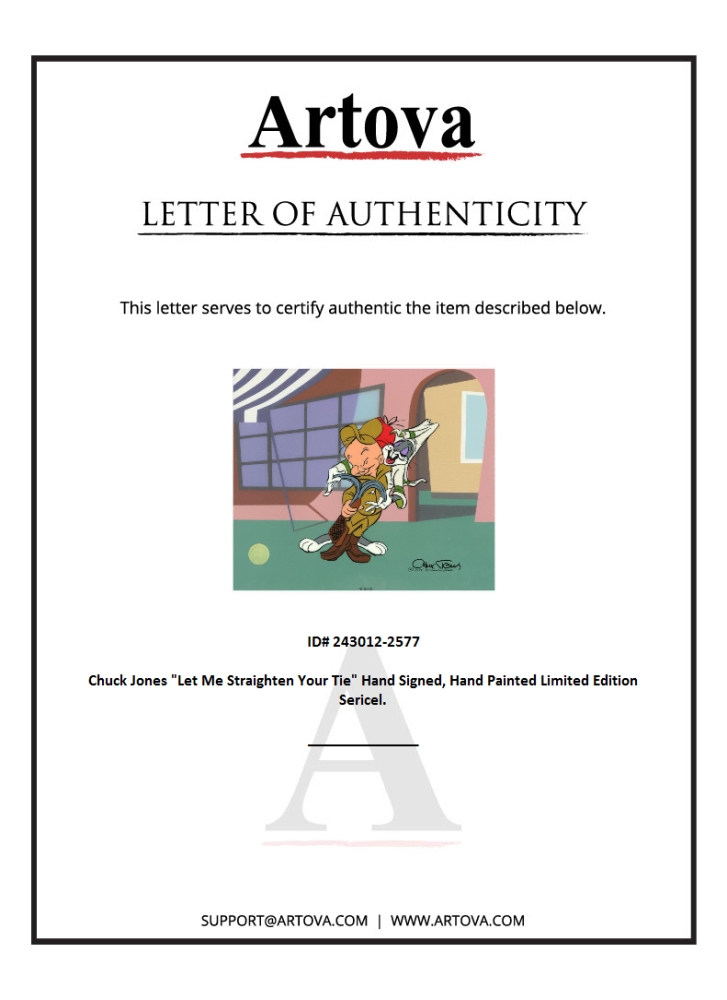 "Let Me Straighten Your Tie" is a limited edition animation cel with hand painted coloring on sericel outline. The piece is numbered, hand-signed by Chuck Jones (1912-2002), and includes a Certificate of Authenticity! Measures Approx: 12.5" x 10.5"