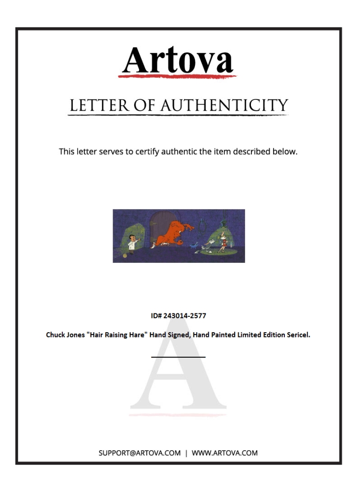 "Hair Raising Hare" is a limited edition animation cel with hand painted coloring on sericel outline. The piece is numbered, hand-signed by Chuck Jones (1912-2002), and includes a Certificate of Authenticity! Measures Approx: 33" x 13.5"