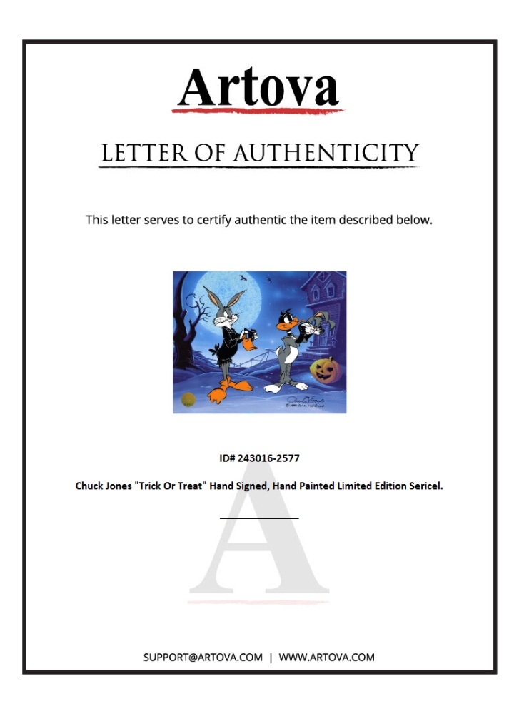 "Trick Or Treat" is a limited edition animation cel with hand painted coloring on sericel outline. The piece is numbered, hand-signed by Chuck Jones (1912-2002), and includes a Certificate of Authenticity. Measures Approx: 12.5" x 10.5"
