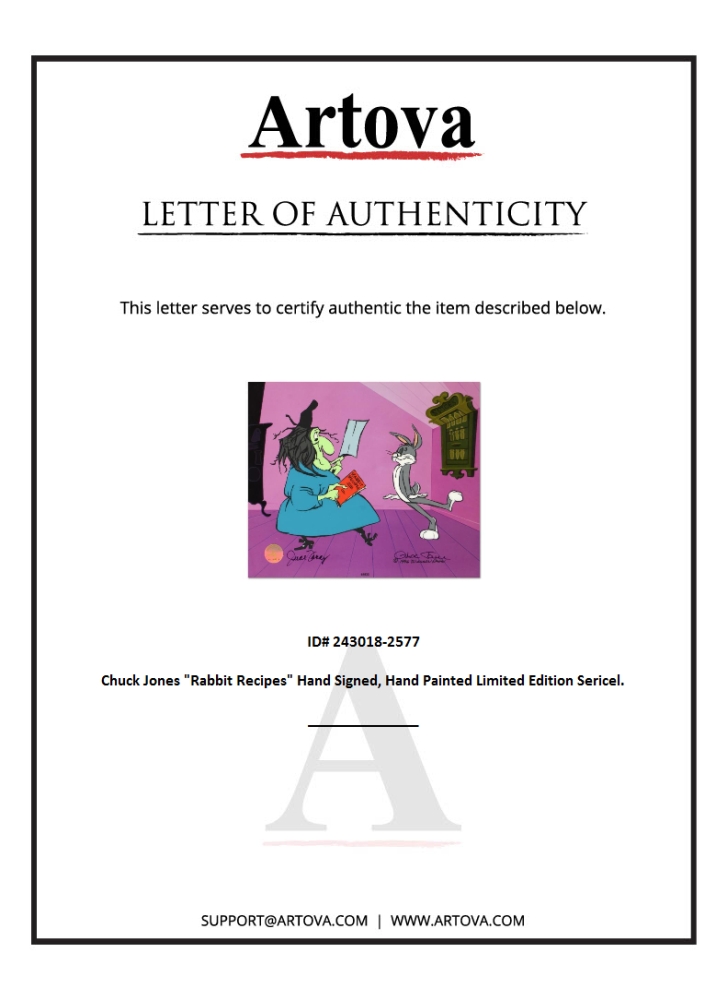 "Rabbit Recipes" is a limited edition animation cel with hand painted coloring on sericel outline. The piece is numbered, hand-signed by Chuck Jones (1912-2002), and includes a Certificate of Authenticity! Measures Approx: 12.5" x 10.5"