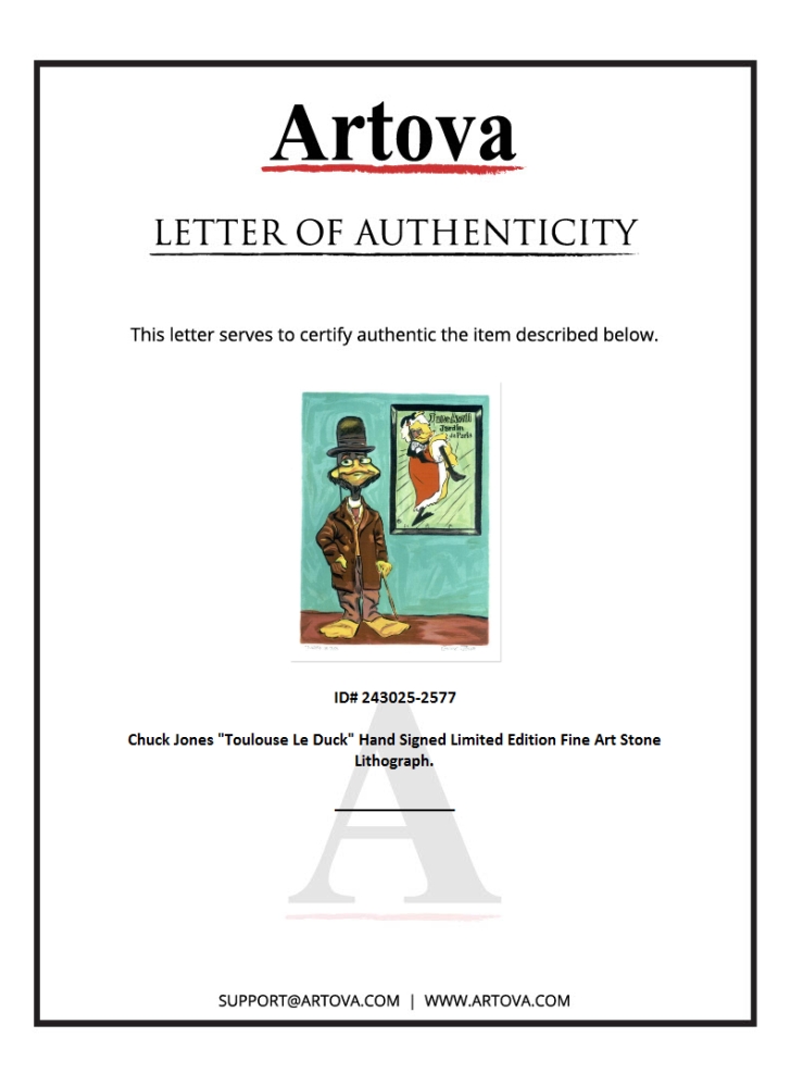 "Toulouse Le Duck" is a limited edition stone lithograph on paper. The piece is numbered, hand-signed by Chuck Jones (1912-2002), and includes a Certificate of Authenticity! Measures Approx: 12" x 16" (image)