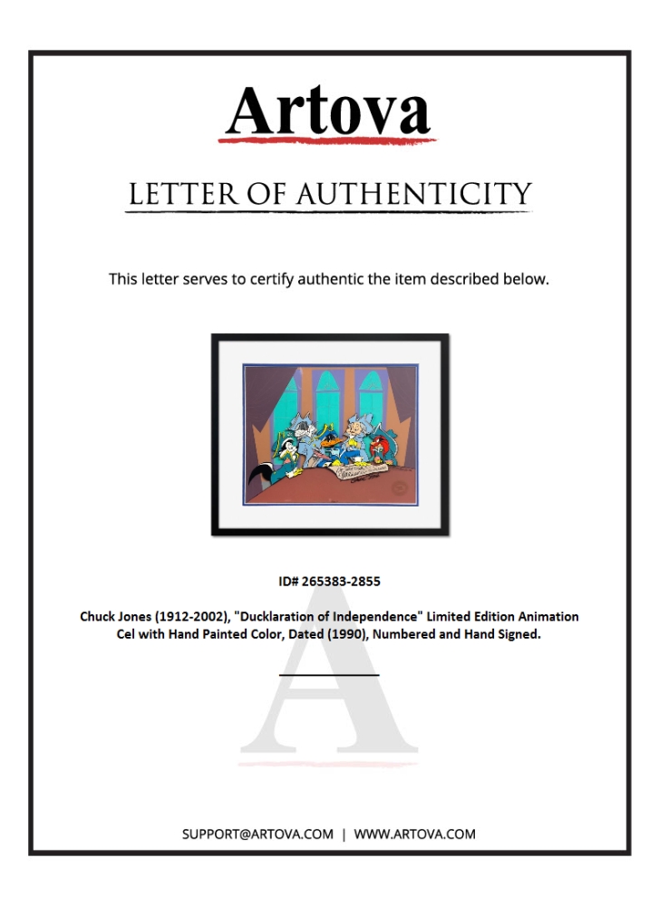 "Ducklaration of Independence" is a SOLD OUT limited edition sericel with hand painted color on sericel outline, dated (1990), numbered and hand signed by Chuck Jones (1912-2002). This piece comes custom framed. This piece bears the official seal of Linda Jones Enterprises and includes Certificate of Authenticity. Measures approx. 19" x 22" (frame); 15" x 8" (image).