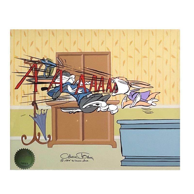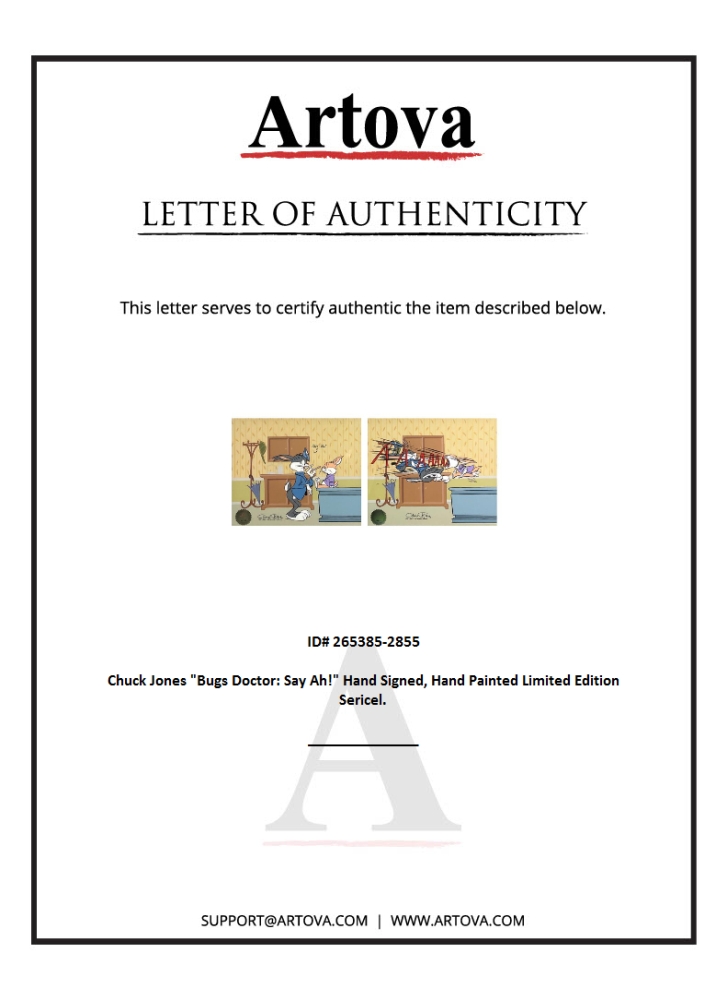 "Bugs Doctor: Say Ah!" is a limited edition sericel diptych with hand painted color. The piece is numbered, hand signed by Chuck Jones (1912-2002), and includes a Certificate of Authenticity! Each piece measures approx: 12.5" x 10.5"