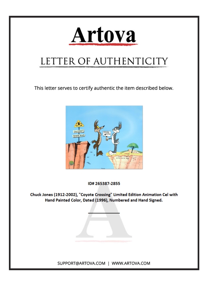 "Coyote Crossing" is a SOLD OUT limited edition animation cel with hand painted color on sericel outline, dated (1996), numbered and hand signed by Chuck Jones (1912-2002)! The sericel comes with a brilliant full-color background and bears the official seal of Linda Jones Enterprises. Measures approx. 13.5" x 16.5".