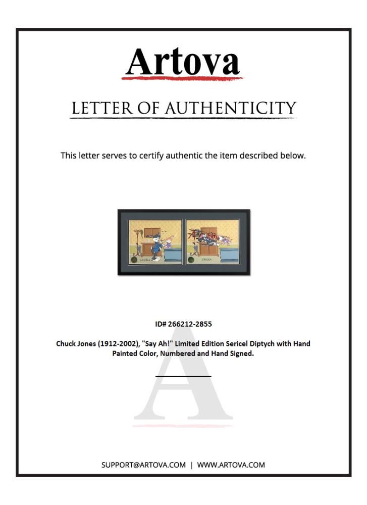 "Bugs Doctor: Say Ah!" is a limited edition sericel diptych with hand painted color on sericel outline, dated (1994), numbered and hand signed by Chuck Jones (1912-2002). This piece comes custom framed. This piece bears the official seal of Linda Jones Enterprises and includes Certificate of Authenticity. Measures approx. 30" x 15" (frame); 10" x 25" (image).