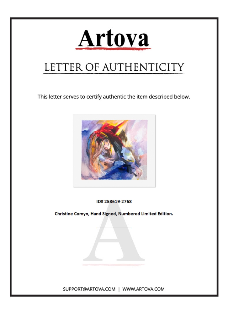 This is a limited edition serigraph on paper by Christine Comyn. The piece comes hand signed by the artist, numbered, and with a letter of authenticity. Measures approximately 8" x 9" (image).