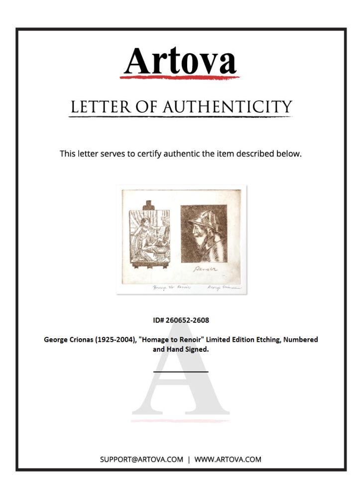 "Homage to Renoir" is a limited edition etching on paper by George Crionas (1925-2004), numbered and hand-signed by the artist. Includes Letter of Authenticity. Measures approx. 14" x 12" (border); 10" x 8" (image). There may be imperfections in the border area but the piece is in good condition.